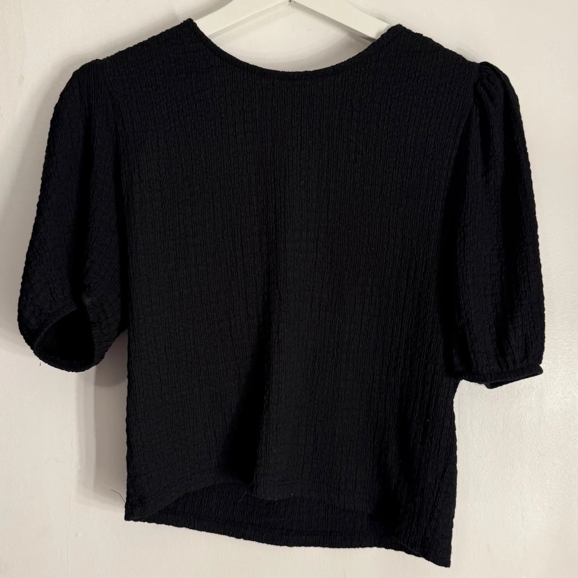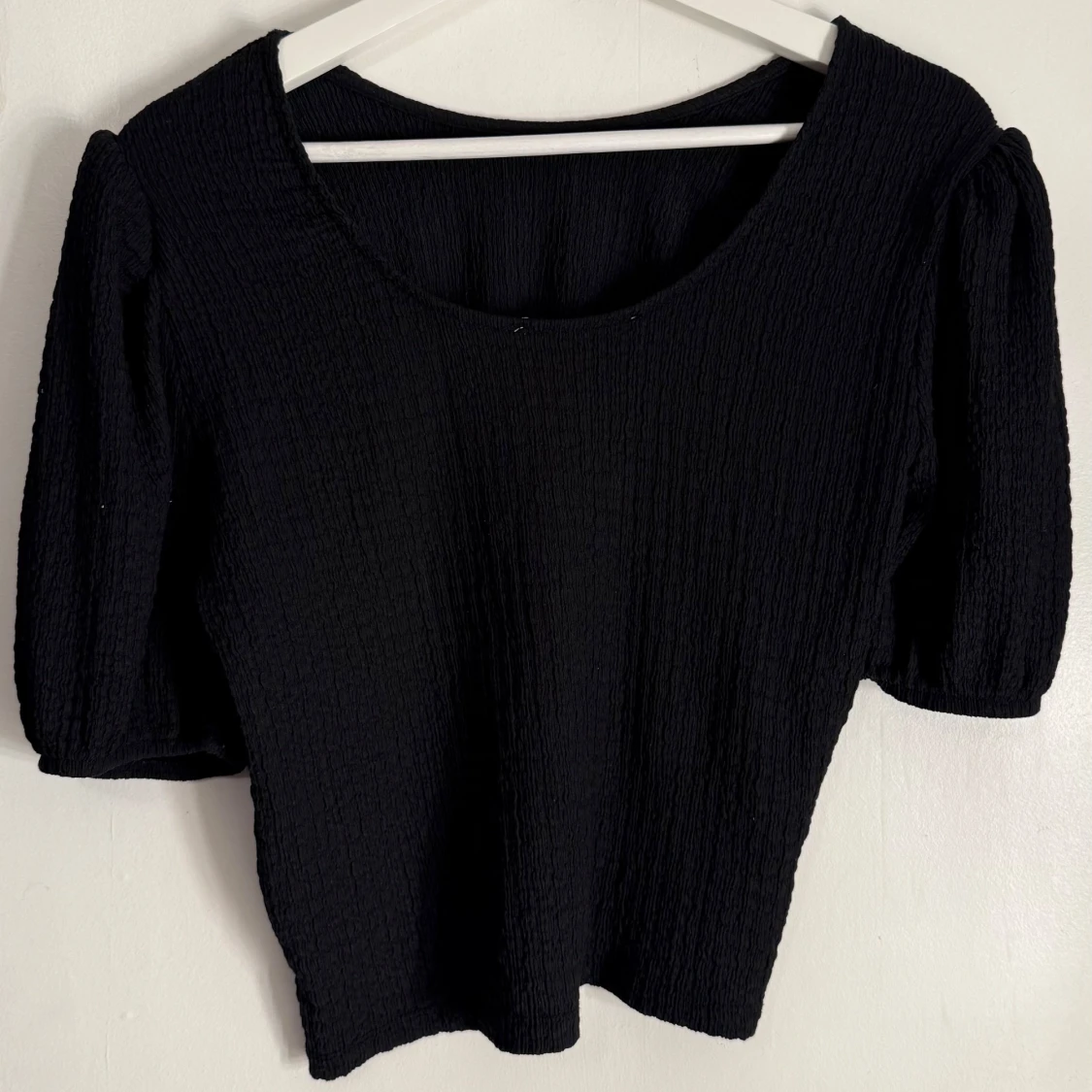 Snygg svart blus med puffiga trekvartsärmar och en rund halsringning. Tyget har en texturerad yta som ger en elegant touch. Perfekt för att klä upp eller ner beroende på tillfälle.