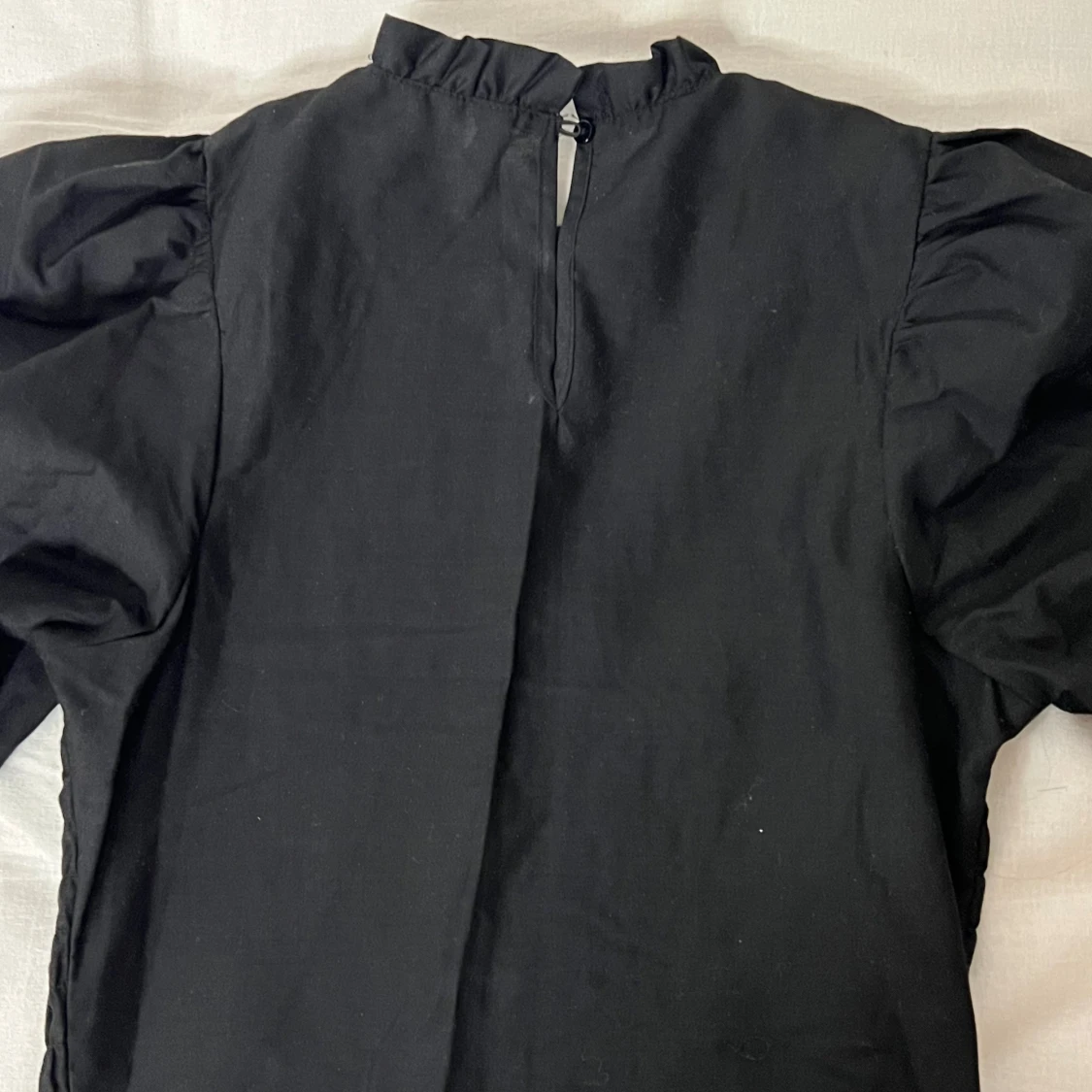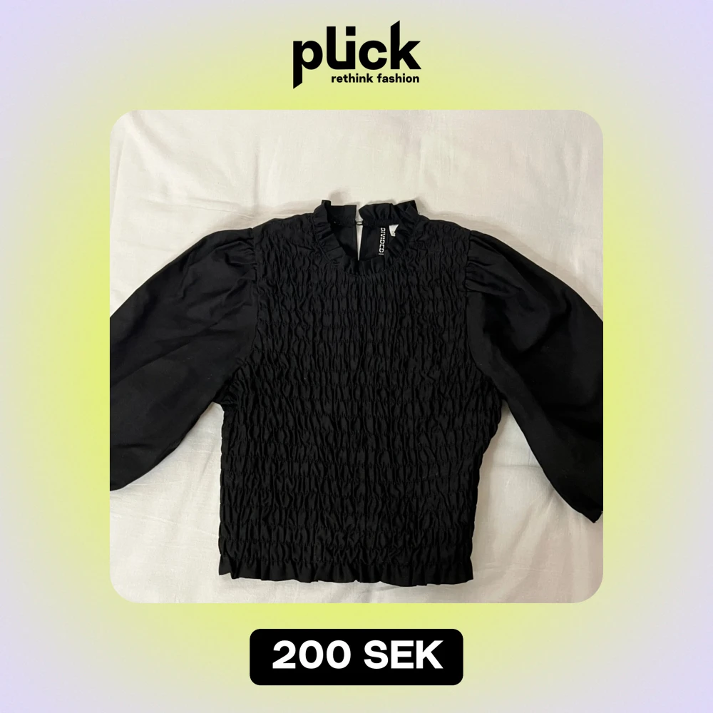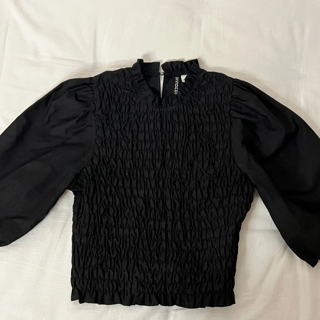 Snygg svart blus med puffiga långärmar och en smockad framsida. Perfekt för både vardag och fest! Blusen har en liten knapp i nacken för enkel påklädning. Passar bra till både jeans och kjol.