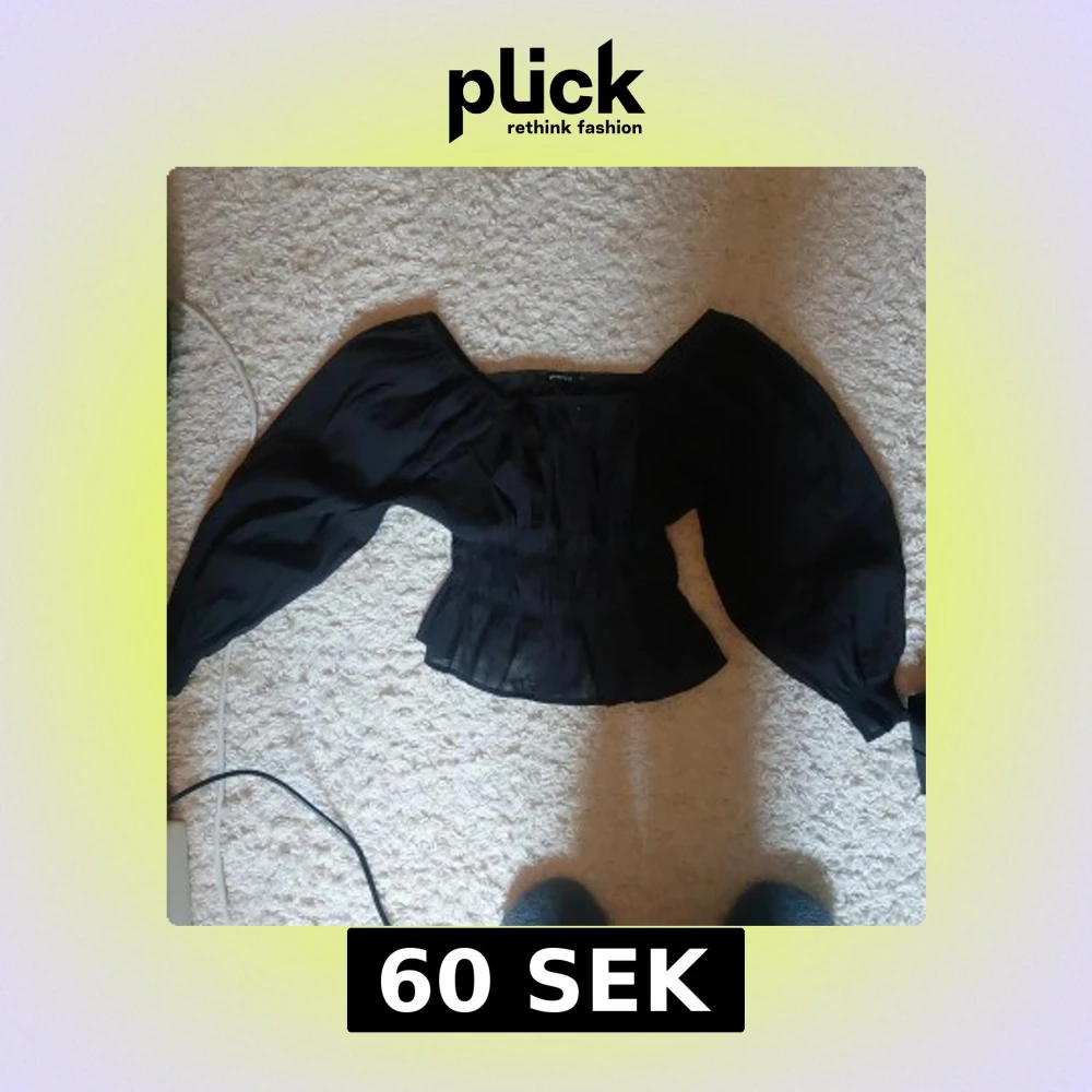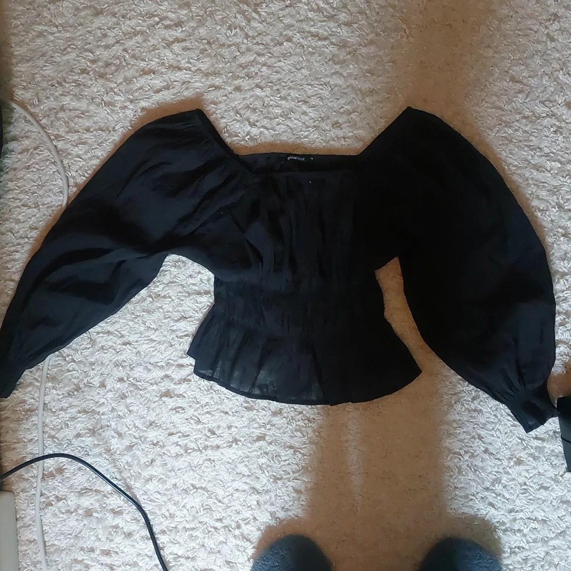 Supersnygg svart blus från Gina Tricot med markerad midja och stora puffärmar. Blusen har en fyrkantig urringning och är tillverkad i ett lätt, transparent tyg som ger en cool och trendig look.