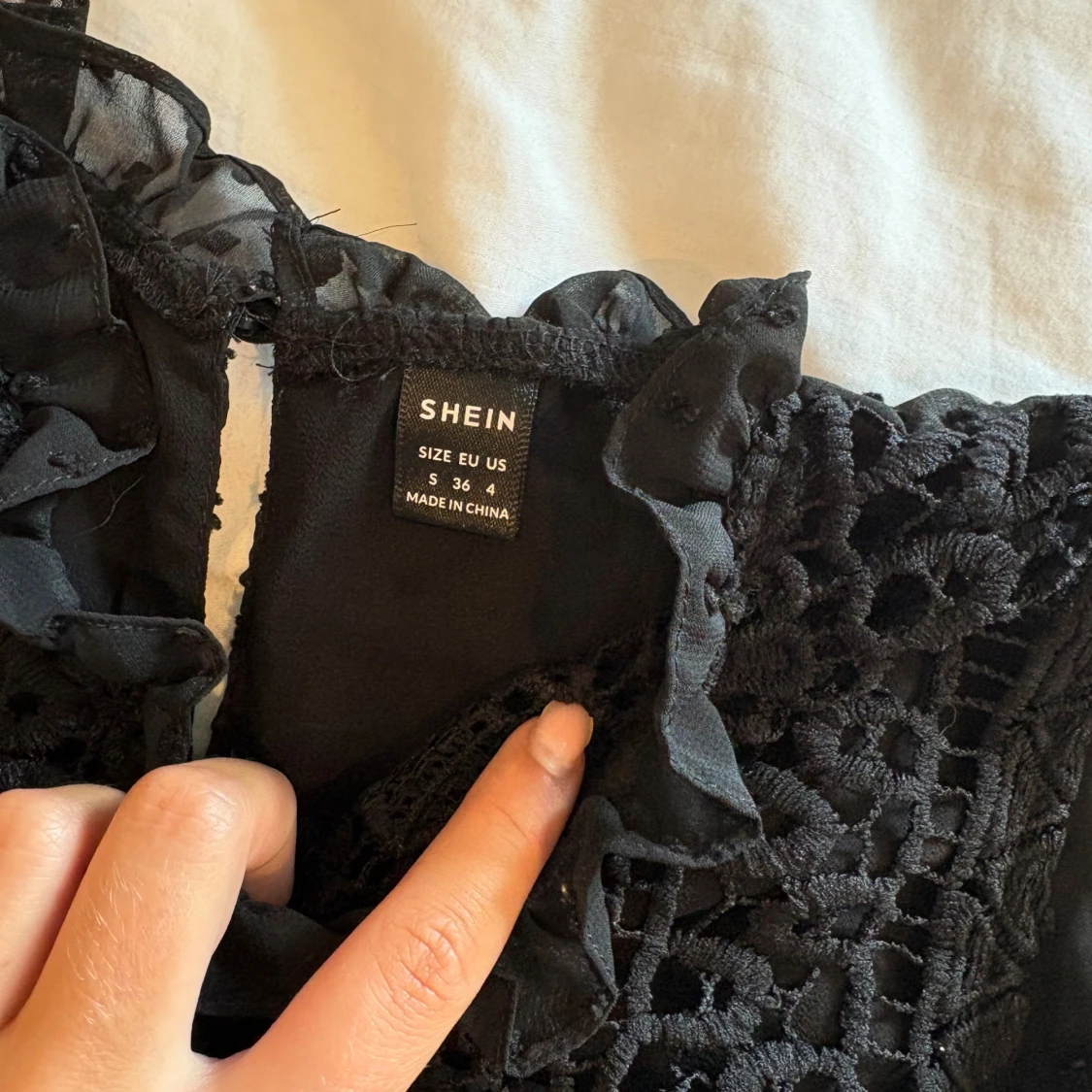 Supersöt svart blus från SHEIN med transparenta prickiga partier och detaljerad spets upptill. Blusen har volang vid axlarna och är ärmlös, perfekt för att lyfta en outfit. Lätt och luftig känsla med fina broderade detaljer.
