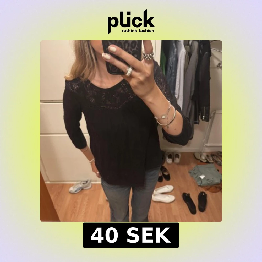 Svart blus från Vila i storlek XS med fina spetsdetaljer upptill och trekvartsärm. Blusen har en lös passform och är perfekt att styla med jeans eller kjol. Materialet känns lätt och luftigt, och spetsen ger en extra touch.