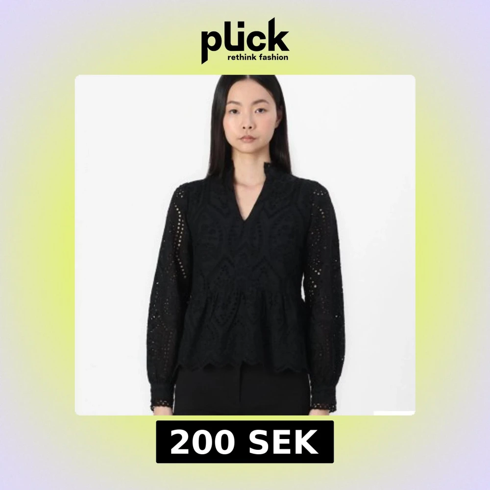 Snygg svart blus med v-ringning och spetsdetaljer. Blusen har långa ärmar och en lätt volang vid nederkanten. Perfekt för en stilren look. Märket är Yas. Kostar 679kr ny❤️