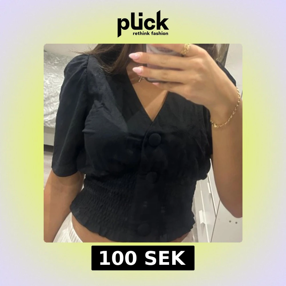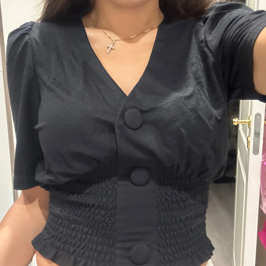 Säljer en svart blus med v-ringning och stora klädda knappar framtill. Toppen har korta puffärmar och smockad midja som ger en snygg siluett. Materialet känns mjukt och lätt, perfekt för att lyfta din outfit.