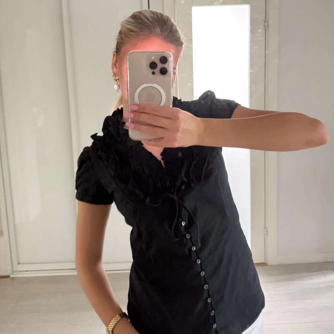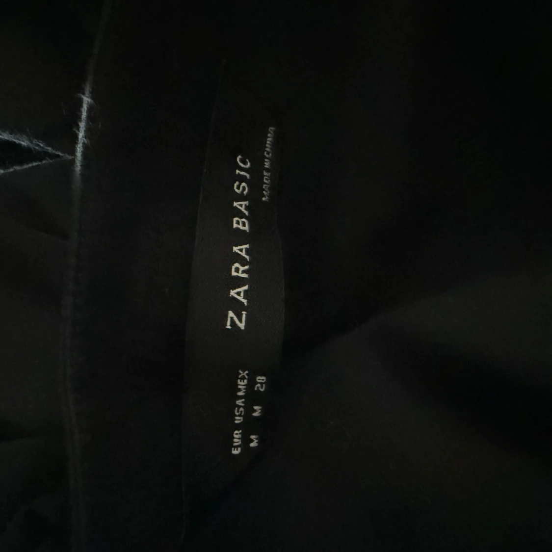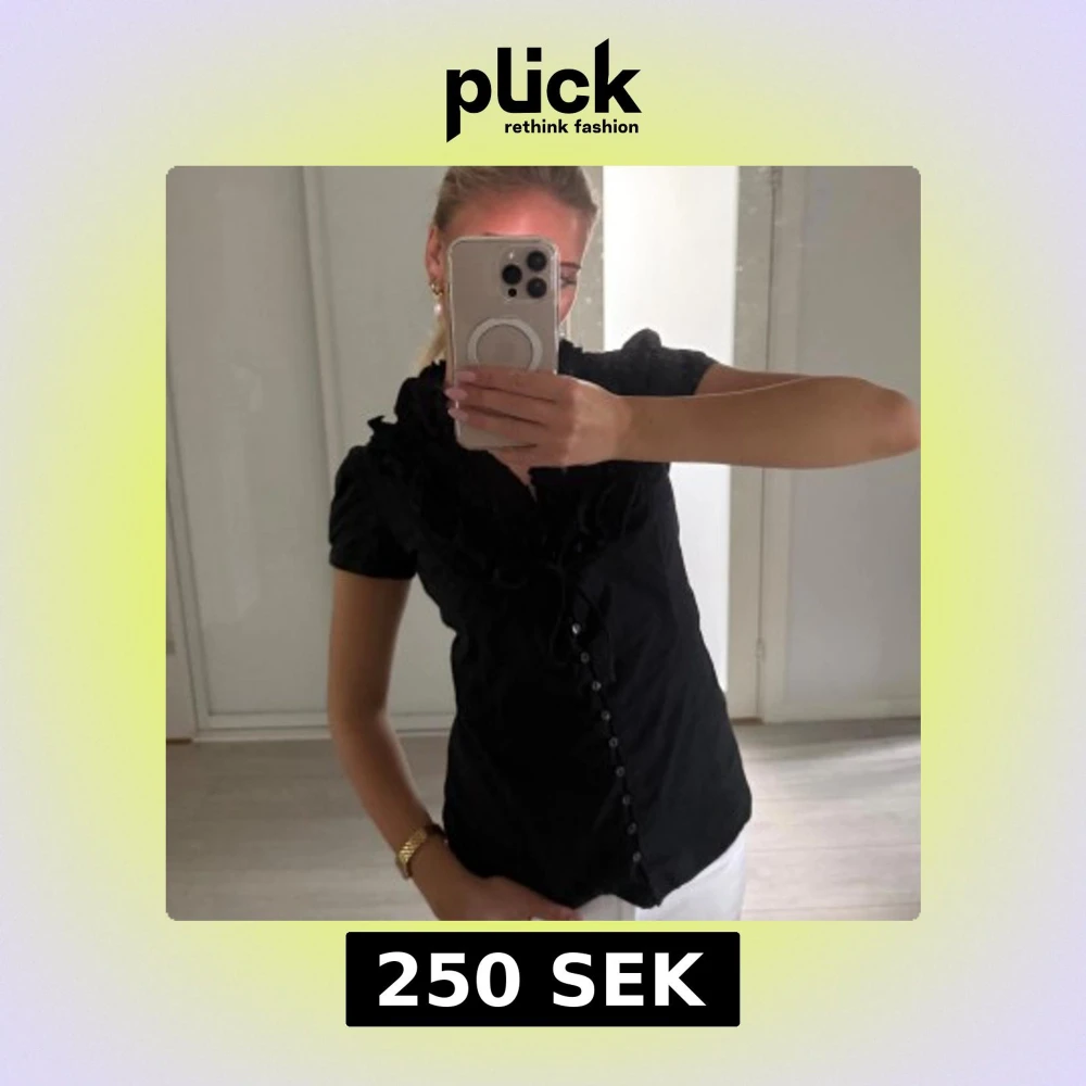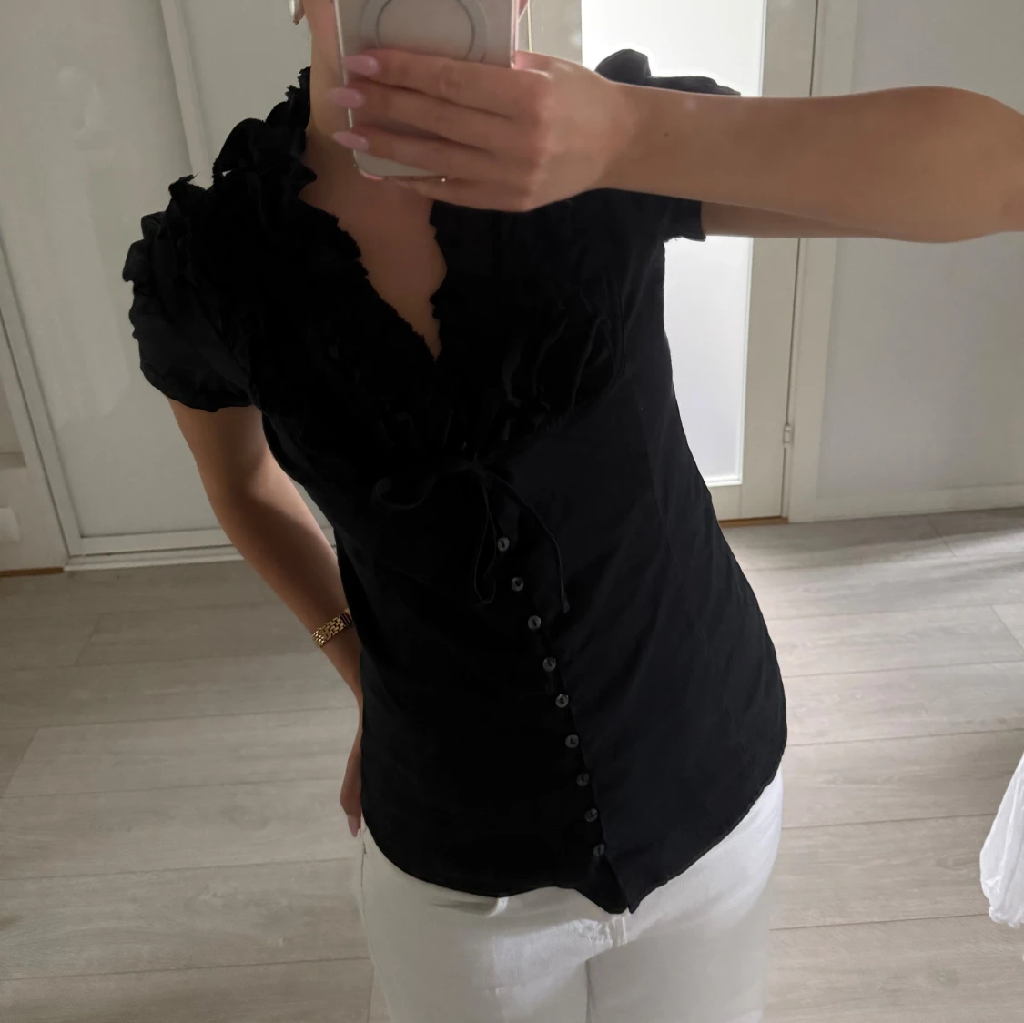 Supersnygg svart blus från Zara Basic med korta puffärmar, volangdetaljer vid halsringningen och knappar framtill. Sitter figurnära och har en feminin v-ringning med knytband. Perfekt för dig som gillar stilrena men ändå unika plagg.