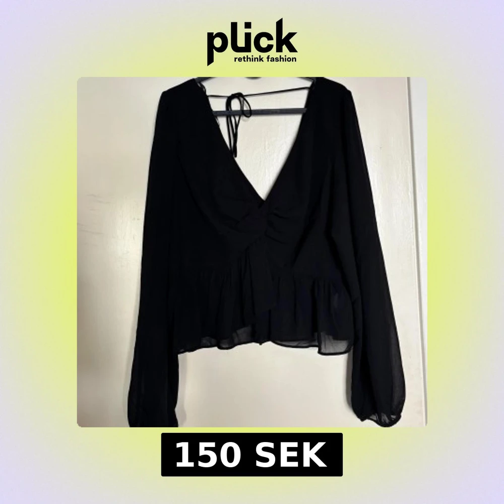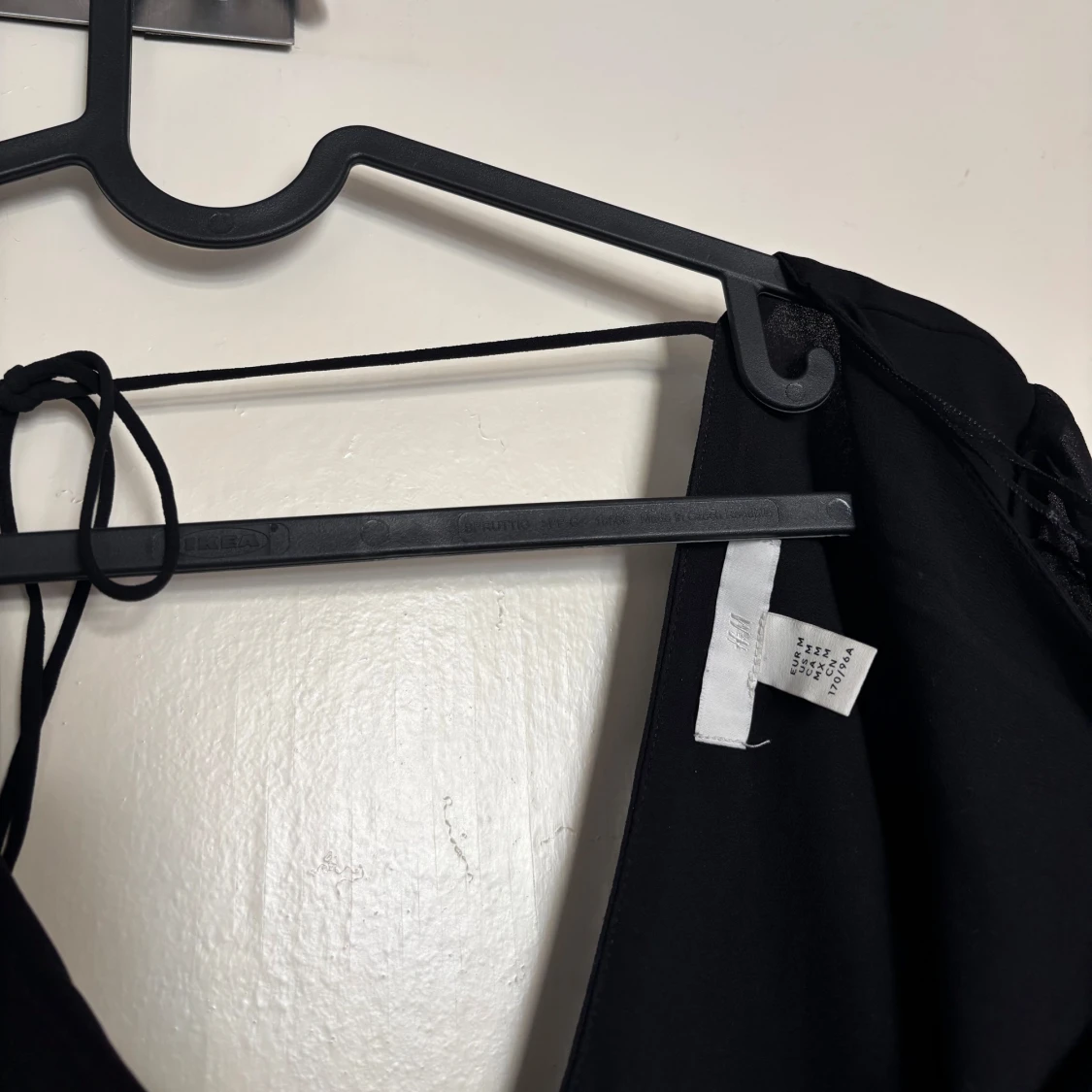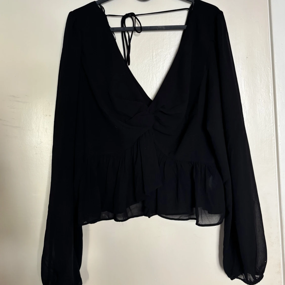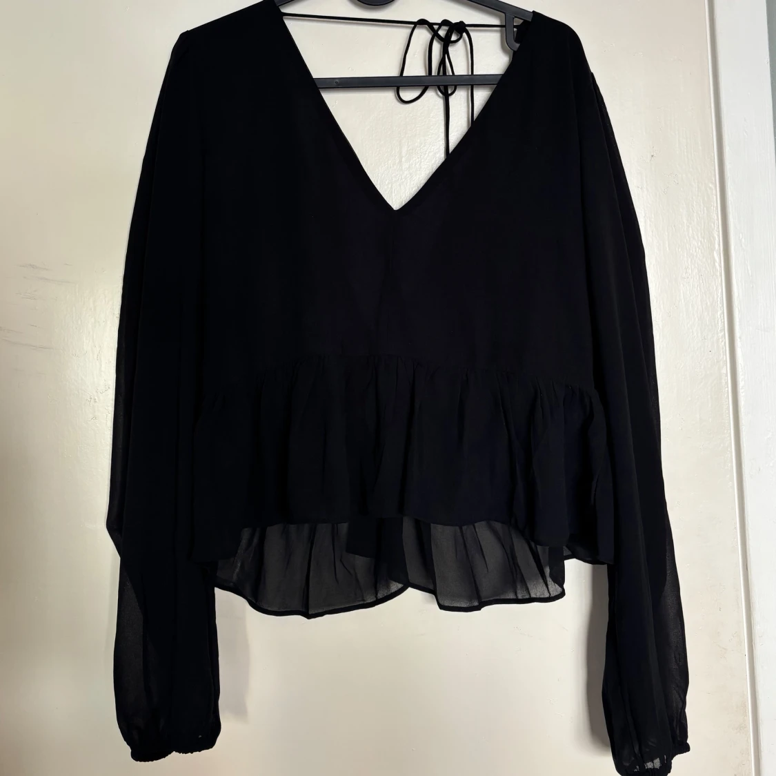 Säljer en svart blus från H&M med v-ringning och knytband i ryggen. Blusen har långa, transparenta ärmar och volang nertill samt med en knytdetalj fram. Perfekt för dig som gillar en luftig och stilren look. Använd en gång, djur- och rökfritt