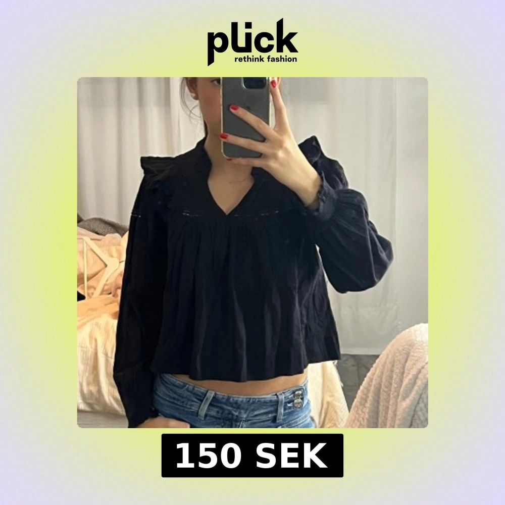 Säljer en svart blus med v-ringning och volangdetaljer vid axlarna. Blusen har långa, lösa ärmar med lätt puff och är croppad i modellen. Tillverkad i ett mjukt bomullstyg som känns skönt mot huden. Perfekt för dig som gillar en trendig och avslappnad look.