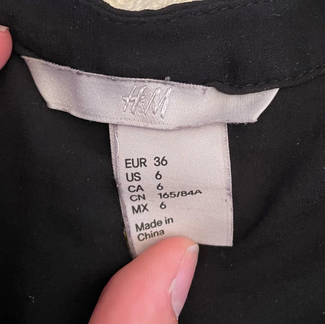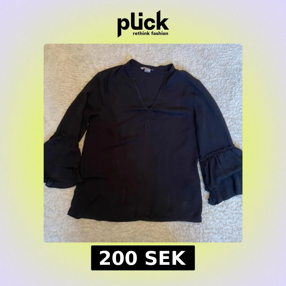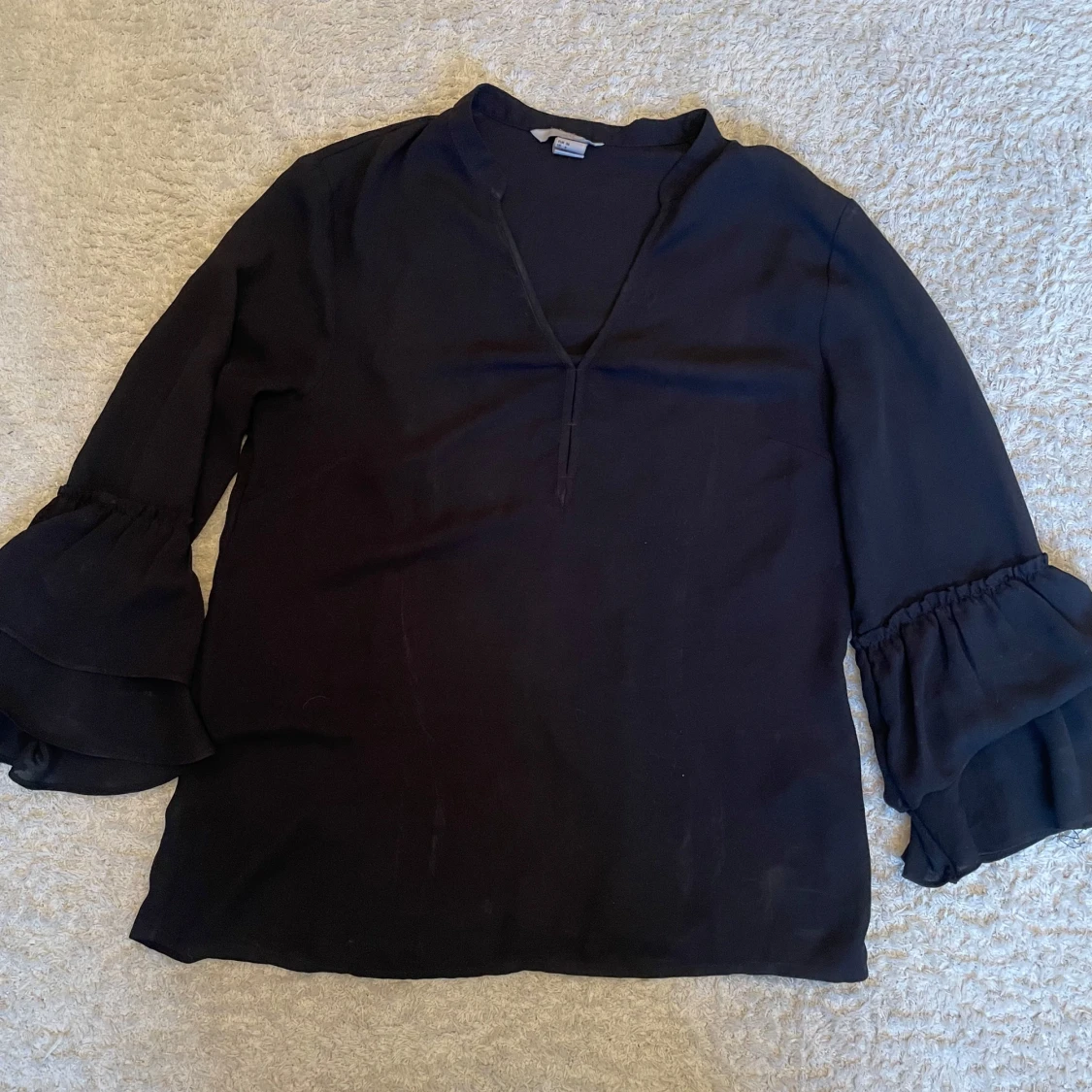 Svart blus från H&M i storlek 36 med snygg v-ringning och volangdetaljer på de långa ärmarna. Blusen har en loose passform och är tillverkad i ett lätt, flowy material som ger en chill vibe. Perfekt för dig som gillar stilrena plagg med lite extra edge.