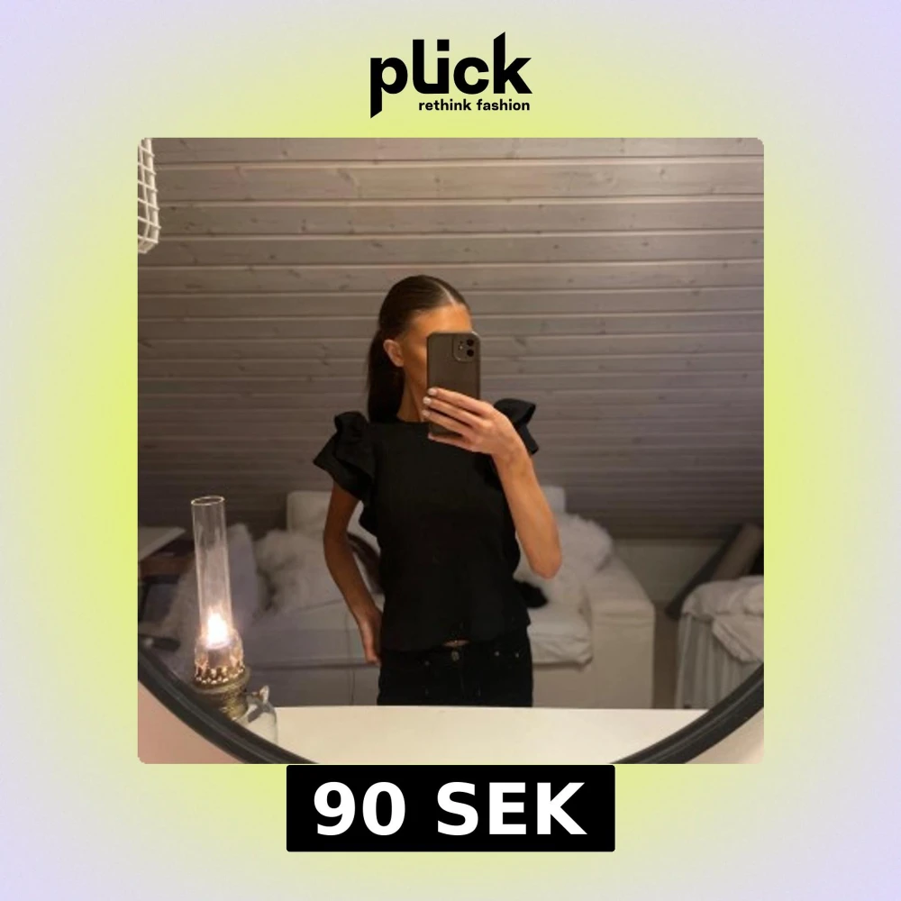 Snygg svart blus med volangdetaljer på ärmarna. Perfekt för en stilren look.
