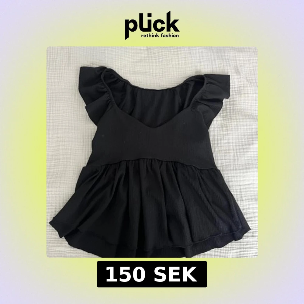 Säljer en svart blus med breda volangärmar och v-ringad hals. Toppen har en luftig, rynkad nederdel som ger en flowy känsla. Materialet är mjukt och lätt, perfekt för dig som gillar en feminin och chill stil. Passar till jeans eller kjol för en snygg look.