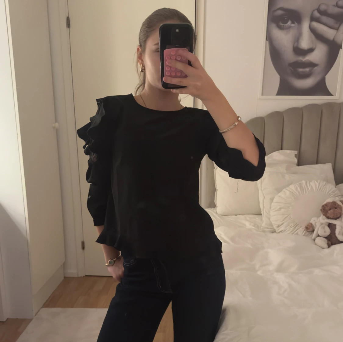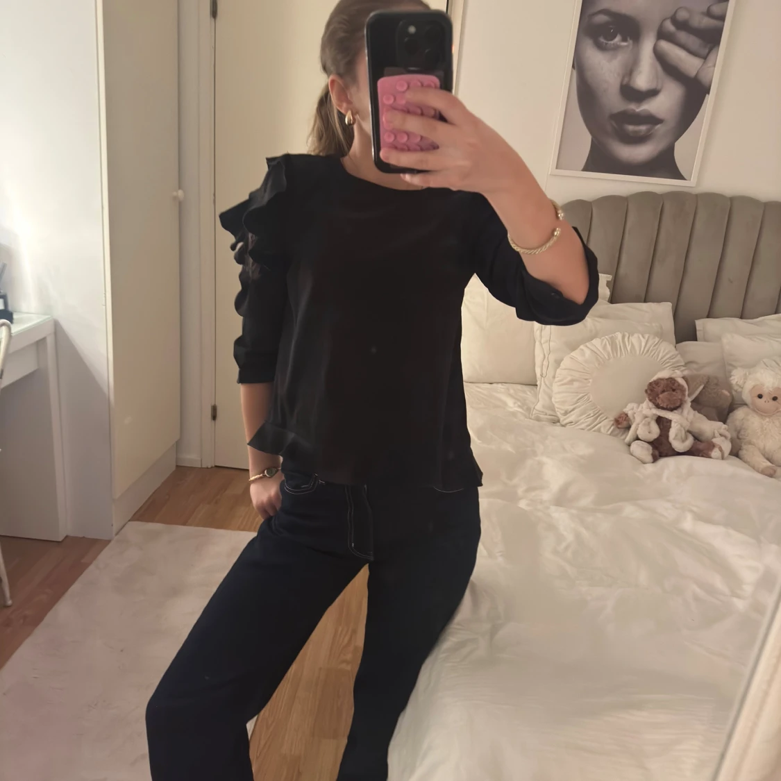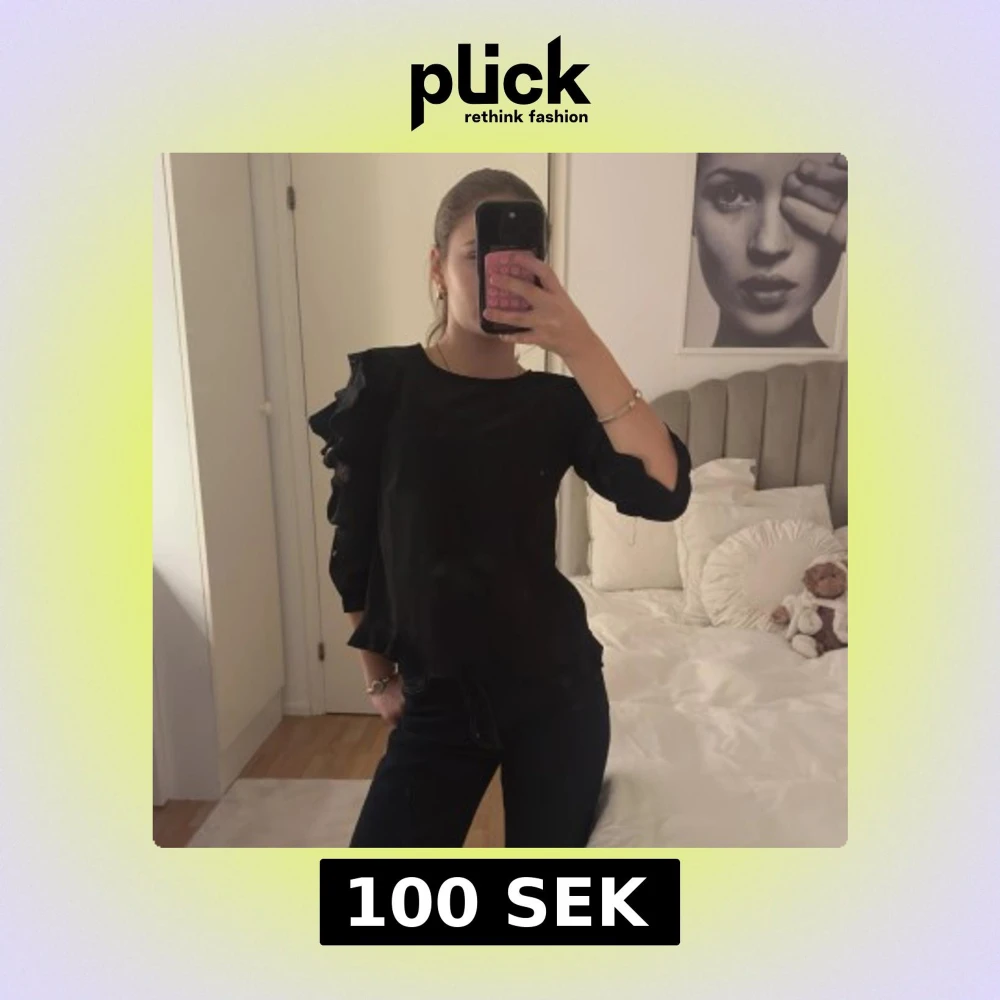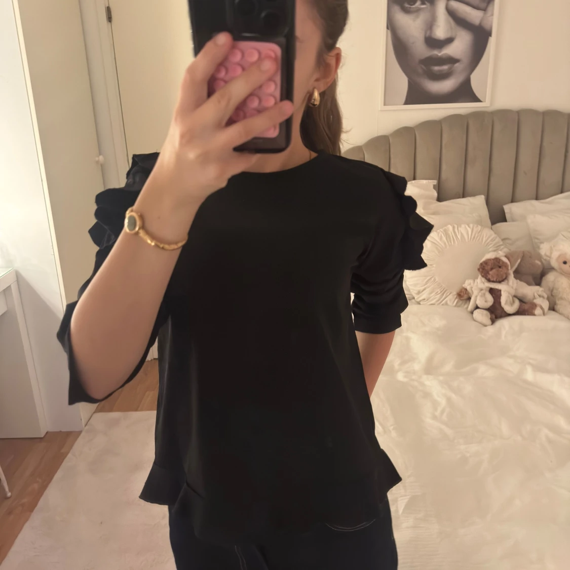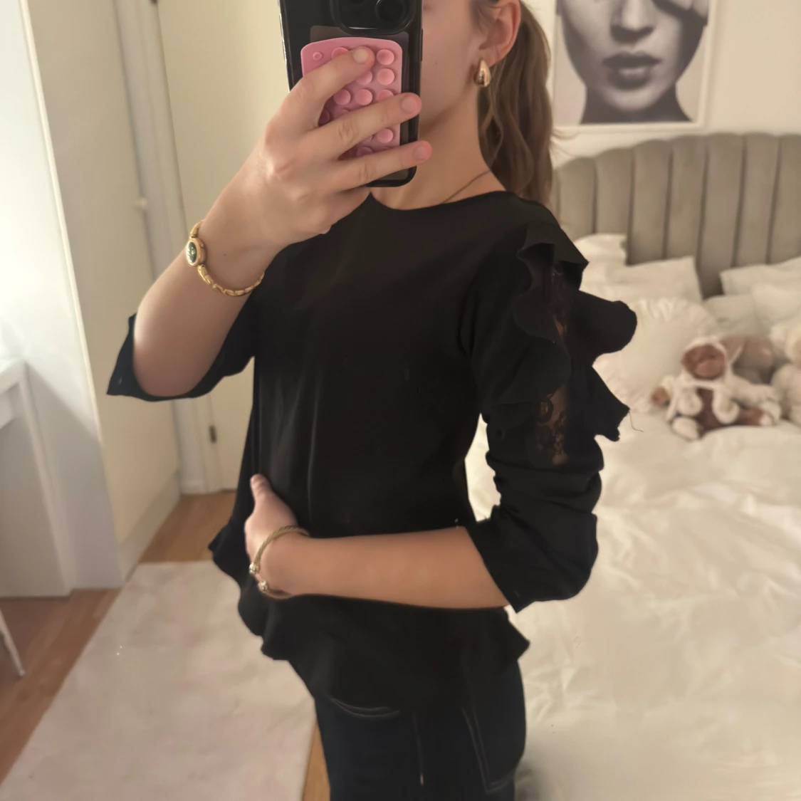 Svart blus med rund hals och unika volangdetaljer på ärmarna. Ärmarna är trekvarts och har inslag av spets som ger en cool touch. Blusen har en loose passform och är tillverkad i ett mjukt, lätt material som känns skönt mot huden.