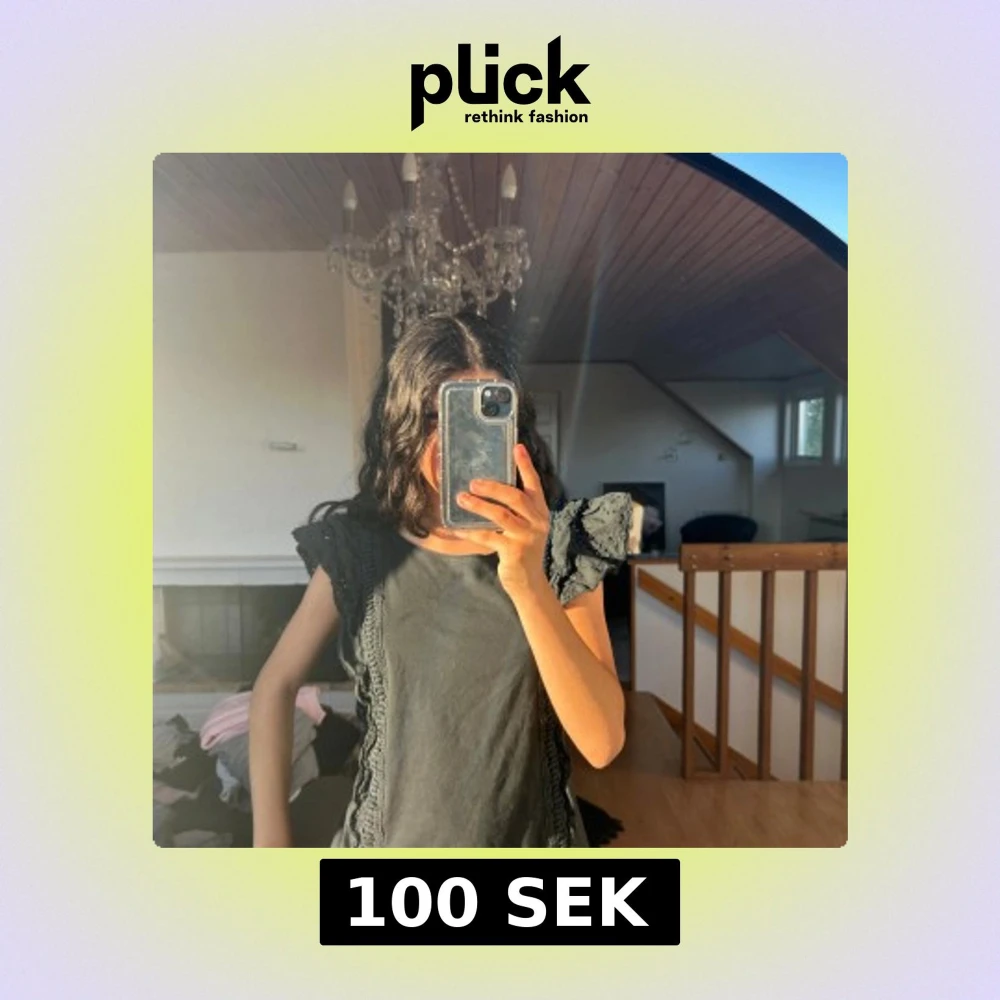 Supersöt svart blus med breda volangärmar och dekorativa spetsdetaljer längs sidorna.