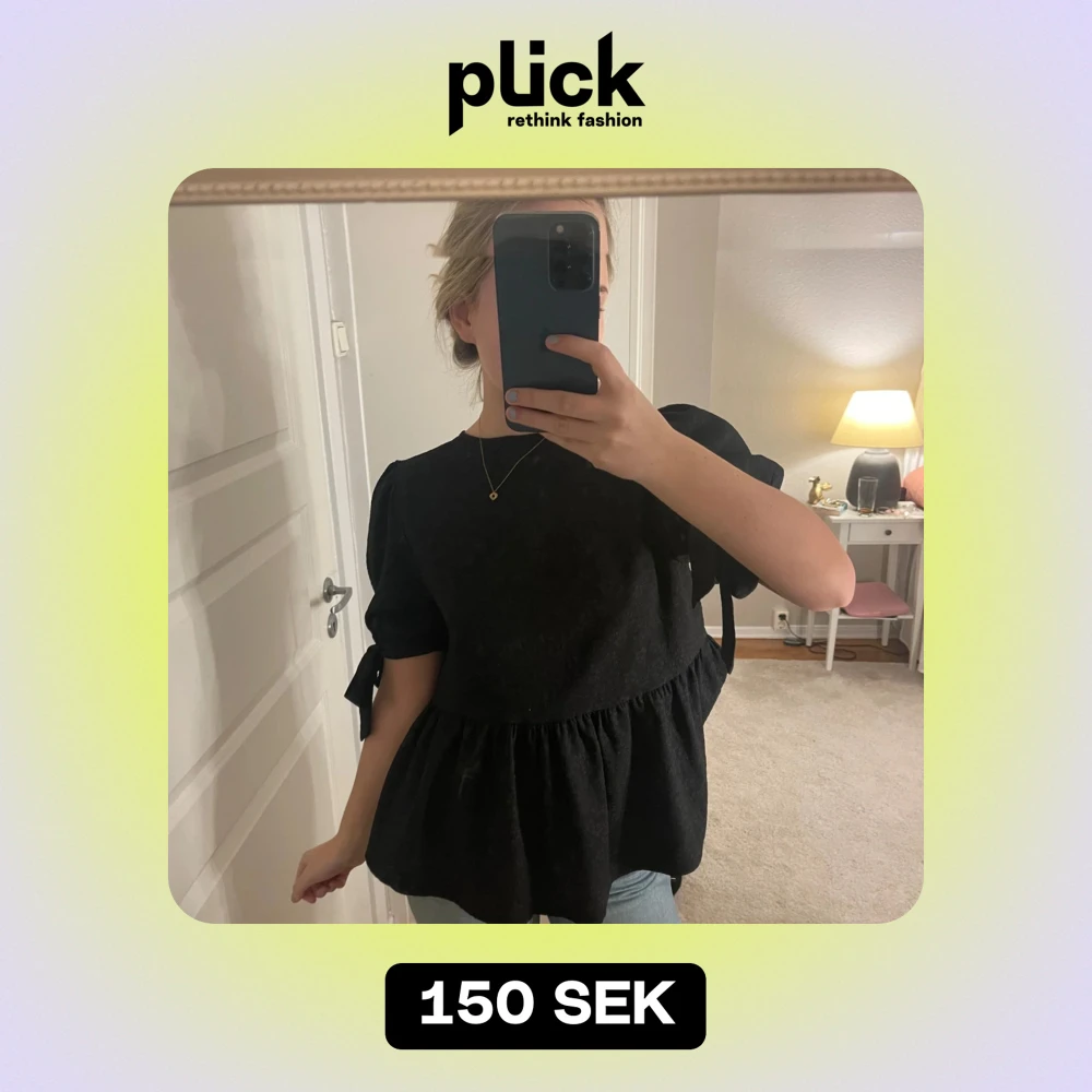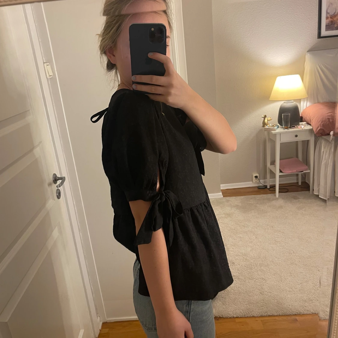 Säljer en svart blus i mycket bra skick. Den har korta ärmar med knytband och en volangdetalj vid midjan som ger en fin siluett. Perfekt för både vardag och fest! Storlek s💕