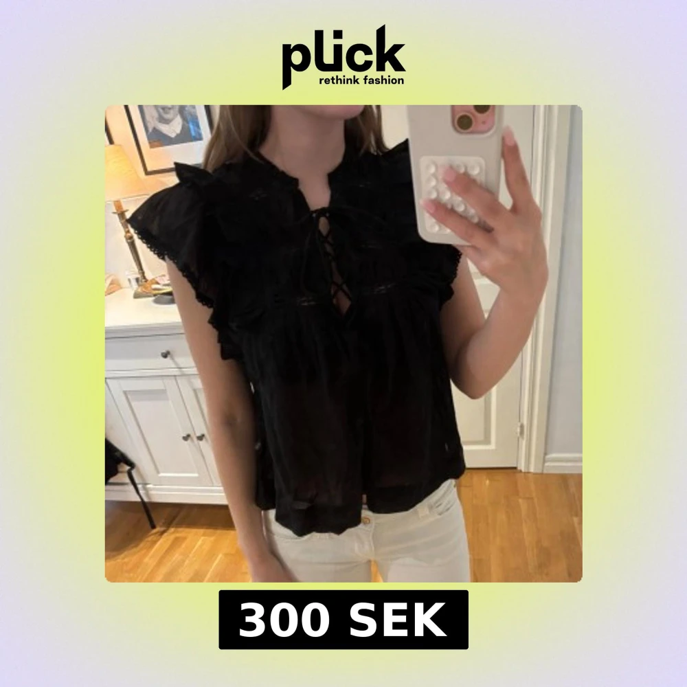 Säljer en svart blus från Neo Noir med volangdetaljer vid axlarna och knytning. Perfekt för att lyfta en outfit eller för en varm sommardag. ( gammla ägarens bilder)