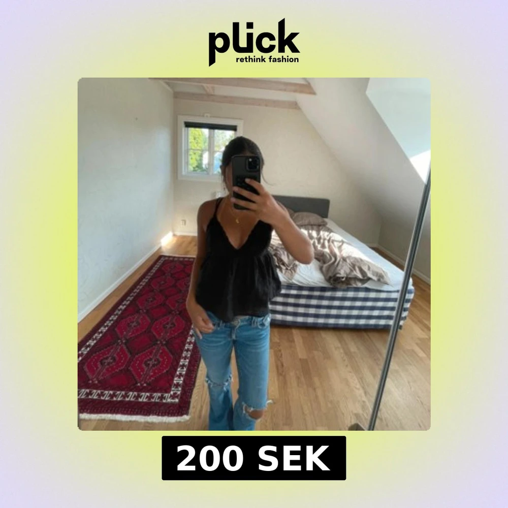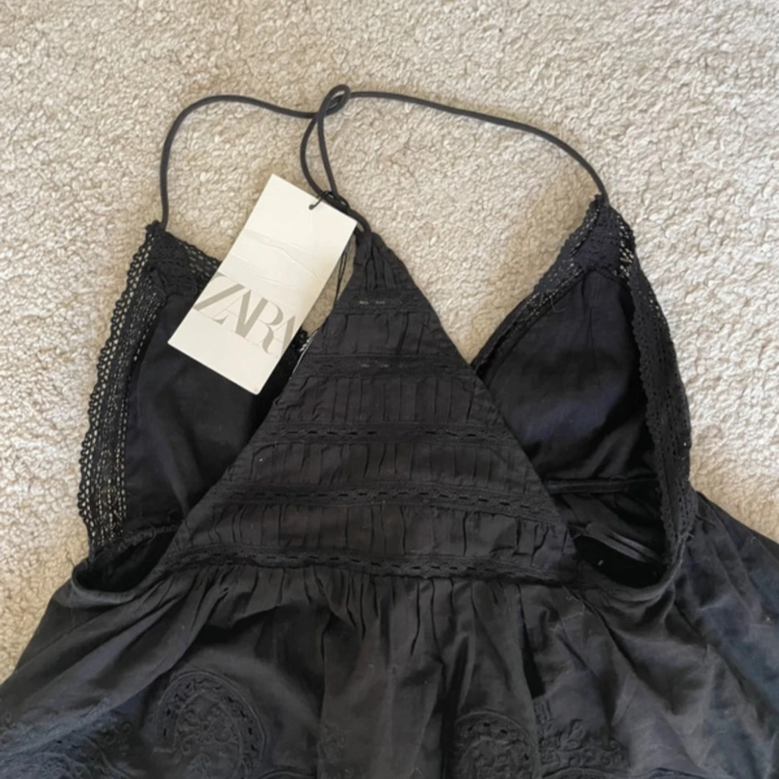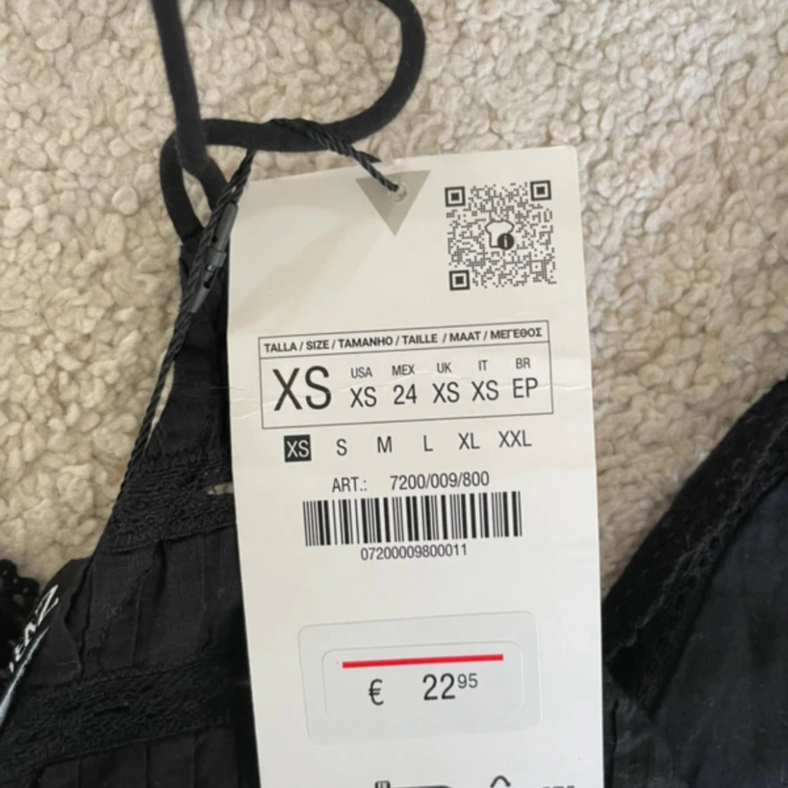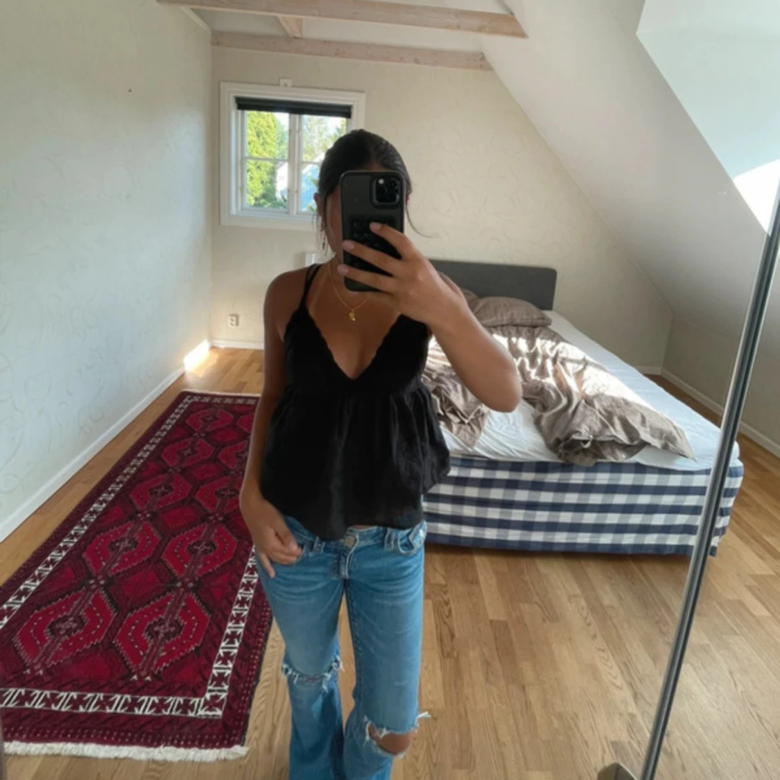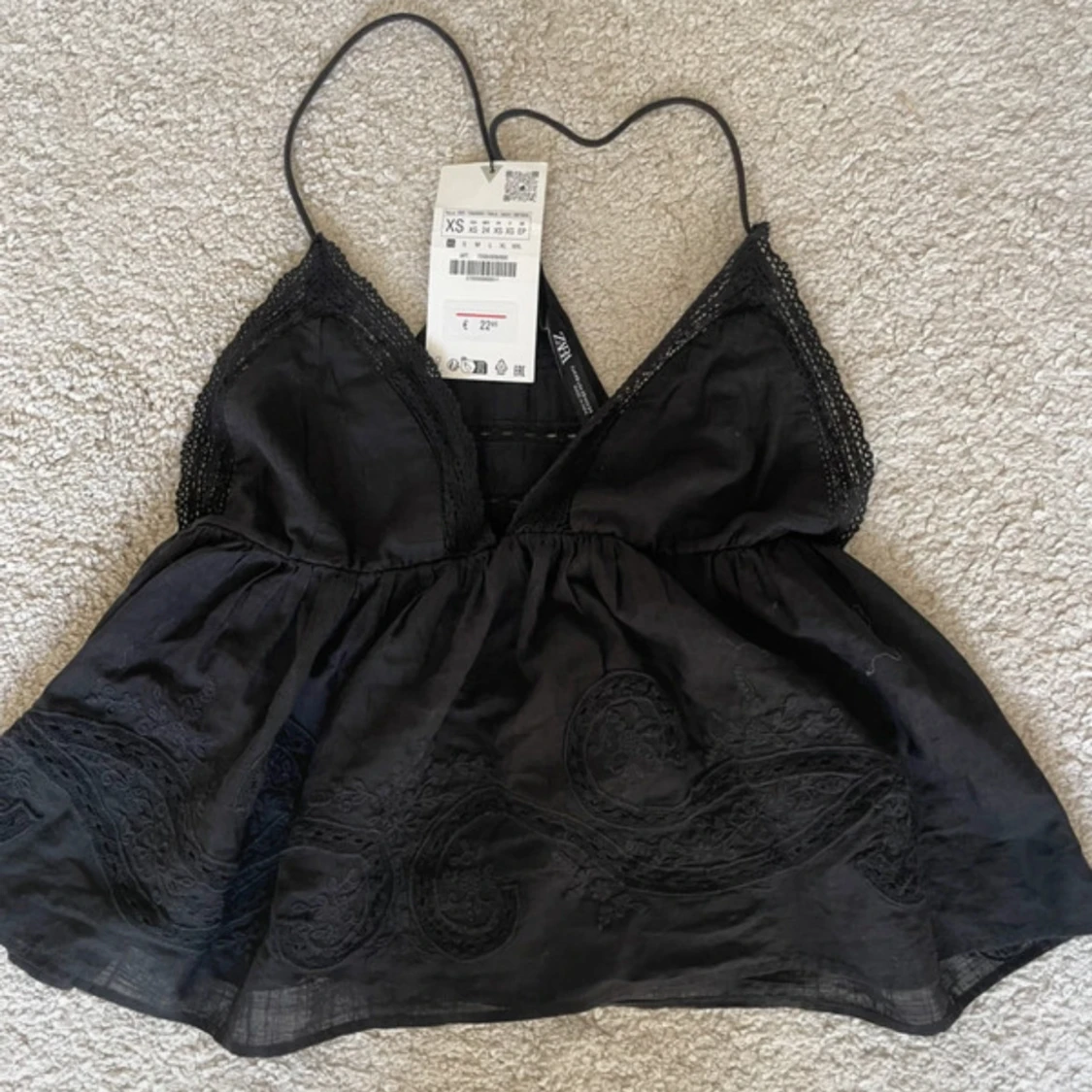 Supersöt svart linnetopp från Zara med tunna axelband, v-ringning och broderade detaljer nertill. Toppen har spetskant vid bysten och en luftig, flowy passform. Perfekt att styla med jeans eller kjol för en trendig look.