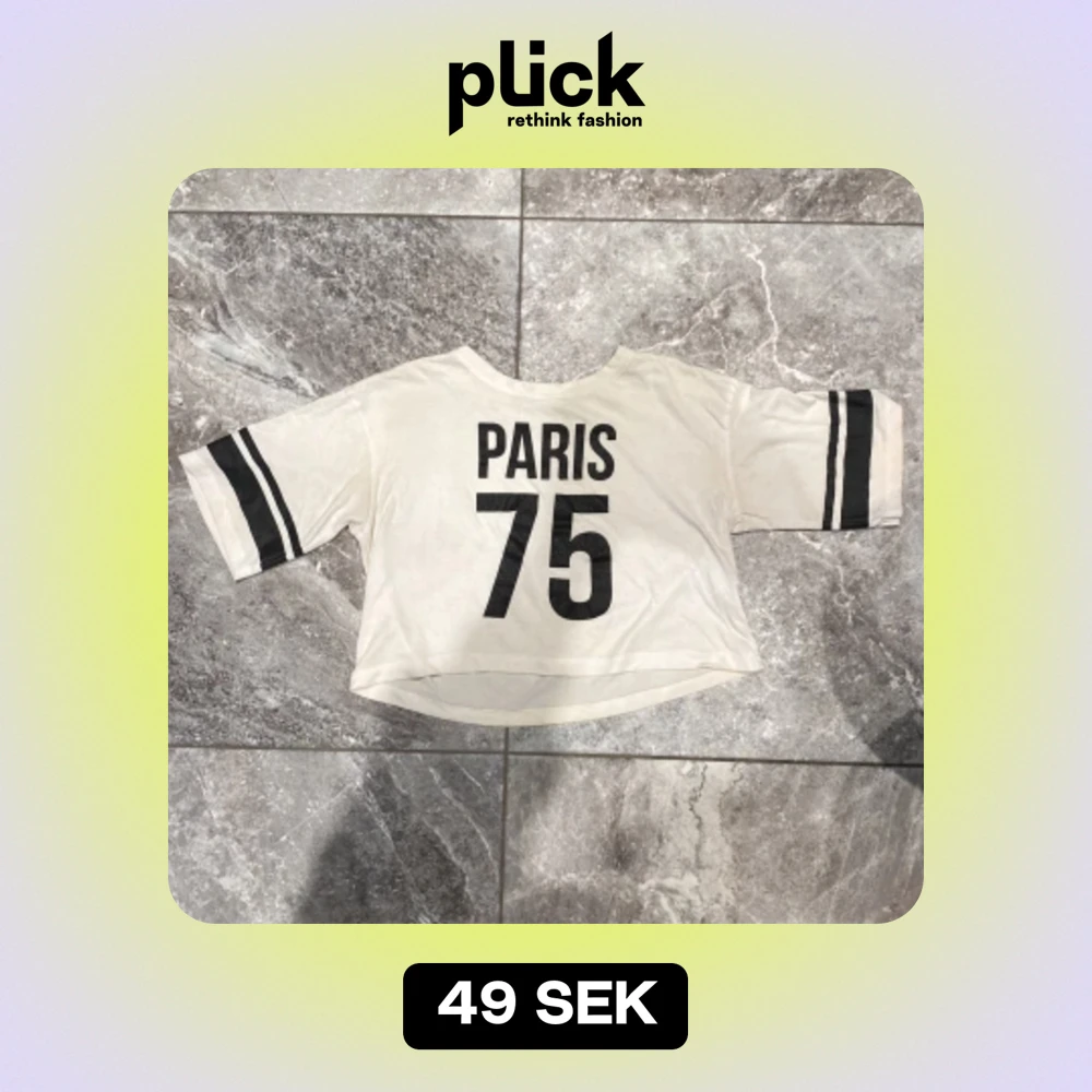 En vit topp med texten 'PARIS 75' i svart på framsidan. Toppen har korta ärmar med svarta ränder och en lös passform.
