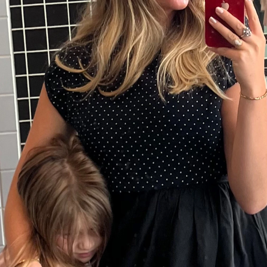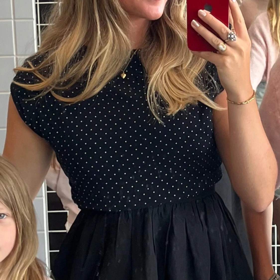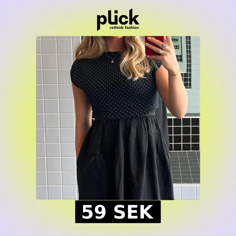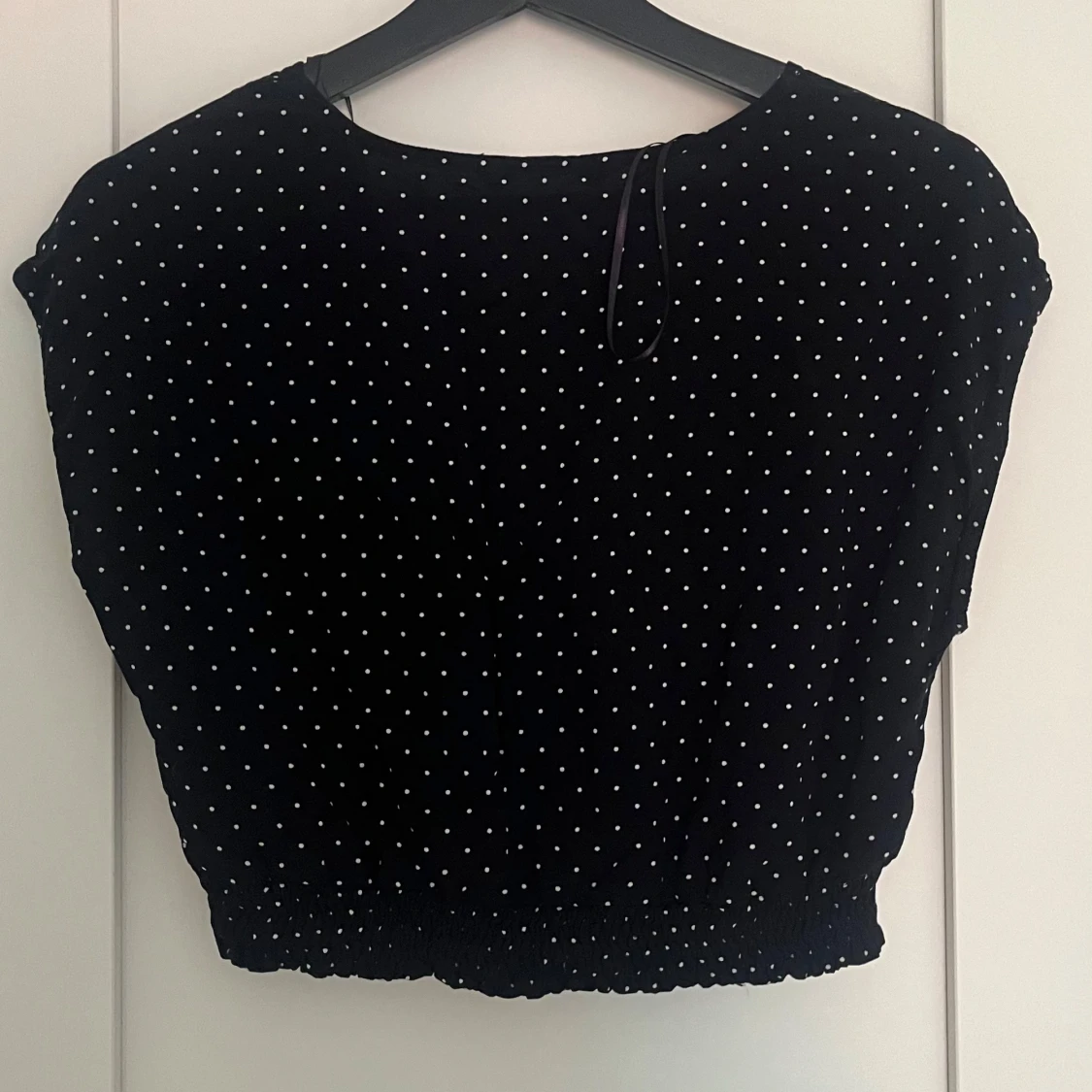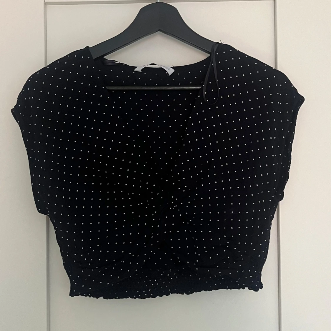 Säljer en svart croppad blus med små vita prickar. Toppen har korta ärmar och resår i nederkanten för en snygg passform. Perfekt till jeans eller kjol för en trendig look.