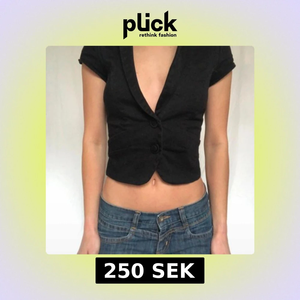 Säljer en svart croppad topp med kavajkrage och korta ärmar. Toppen har två knappar framtill och djup v-ringning. Perfekt för en trendig och edgy look.