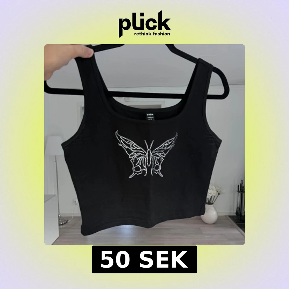 Svart croppad linnetopp med breda axelband och en glittrig fjäril framtill i silvriga stenar. Toppen har en enkel, rak passform och är perfekt för dig som gillar statement-detaljer. Materialet är mjukt och stretchigt <3 Passar S/M! Önskar du veta exakta mått? Tveka inte att höra av dig!