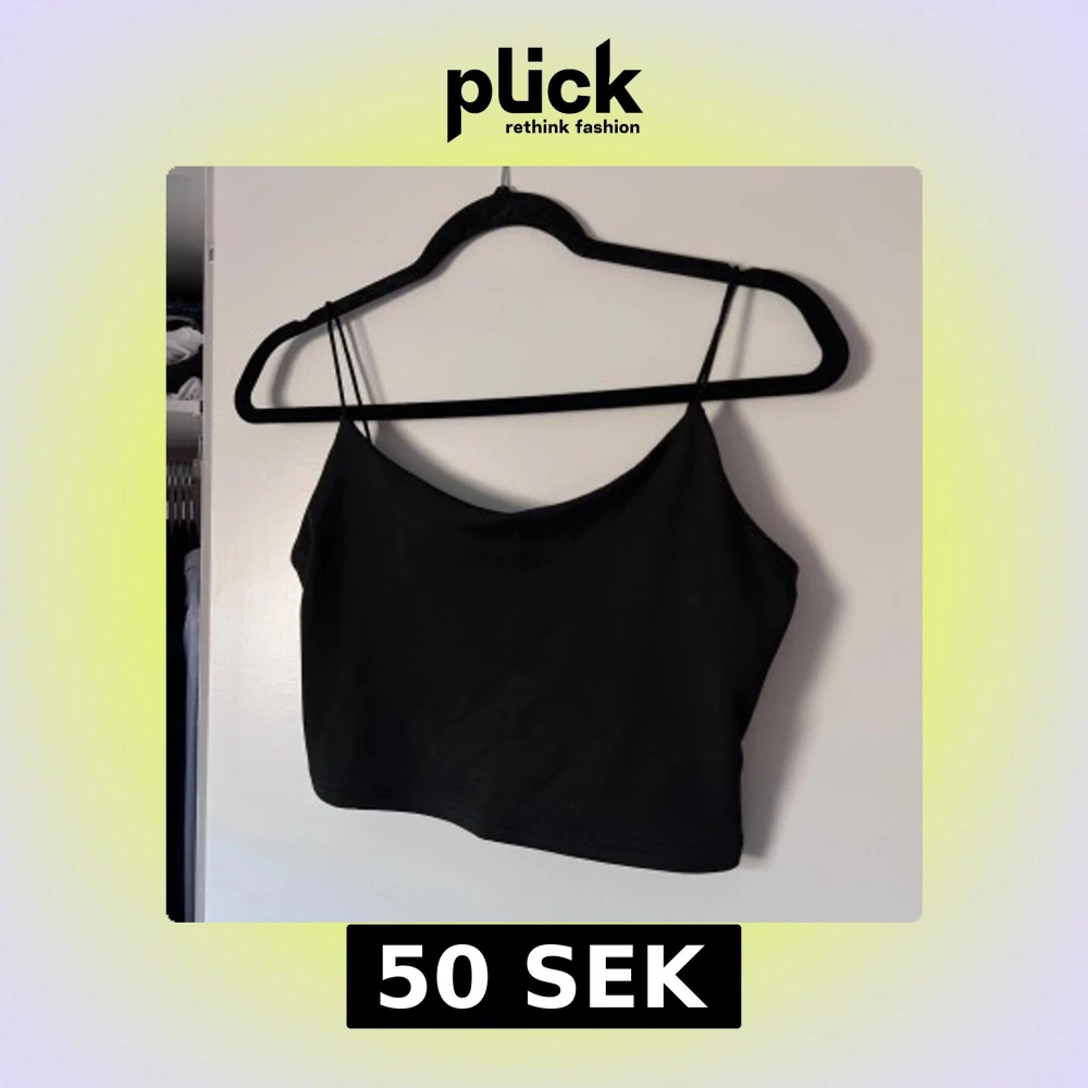 Snygg svart croppad linnetopp med tunna axelband och låg rygg. Perfekt för varma dagar eller som ett lager under en jacka. Enkel och stilren design som passar till det mesta. Aldrig använd. Önskar du veta exakta mått? Tveka inte att höra av dig!