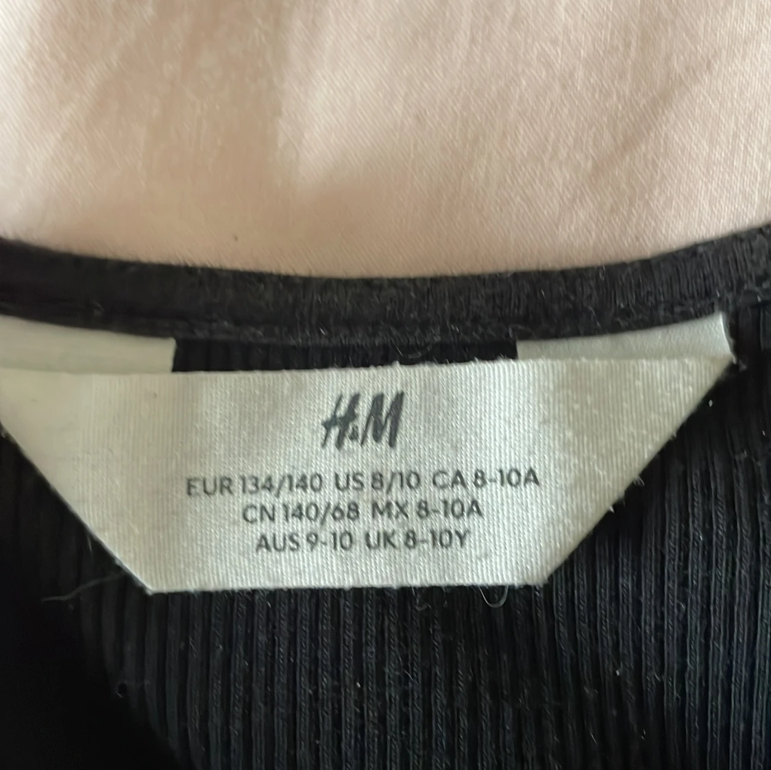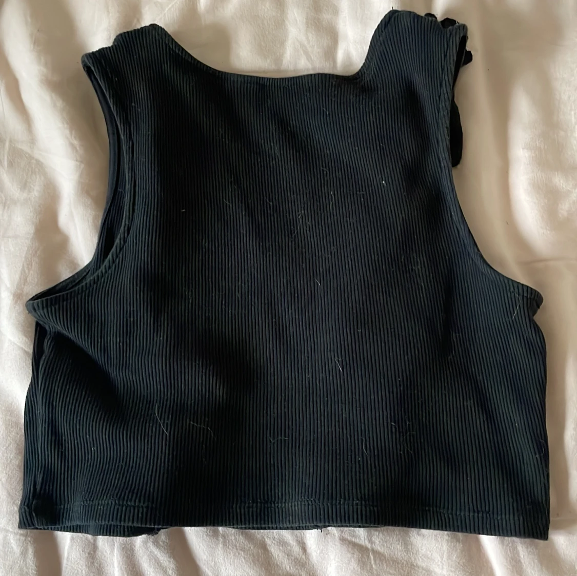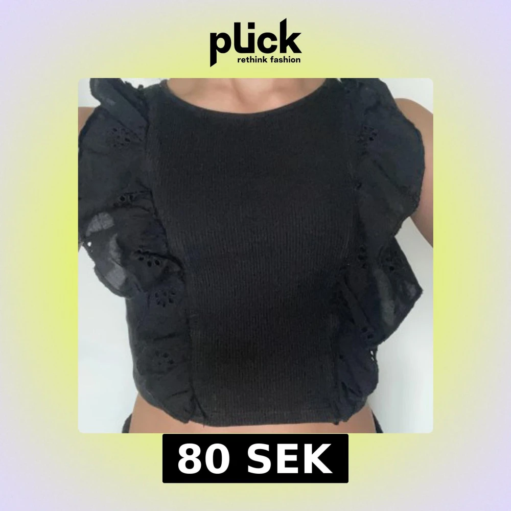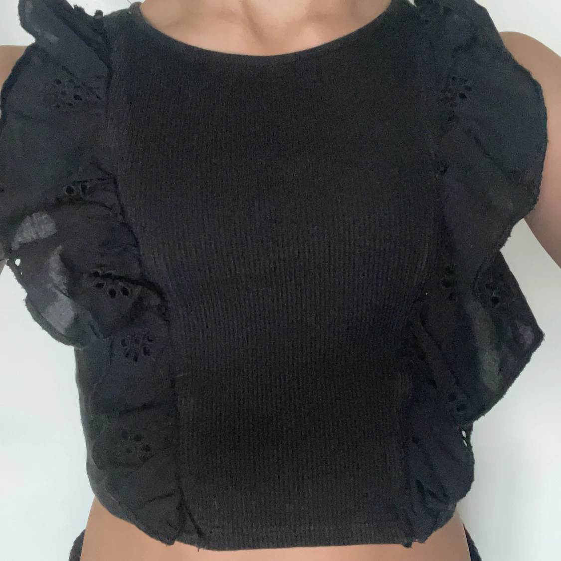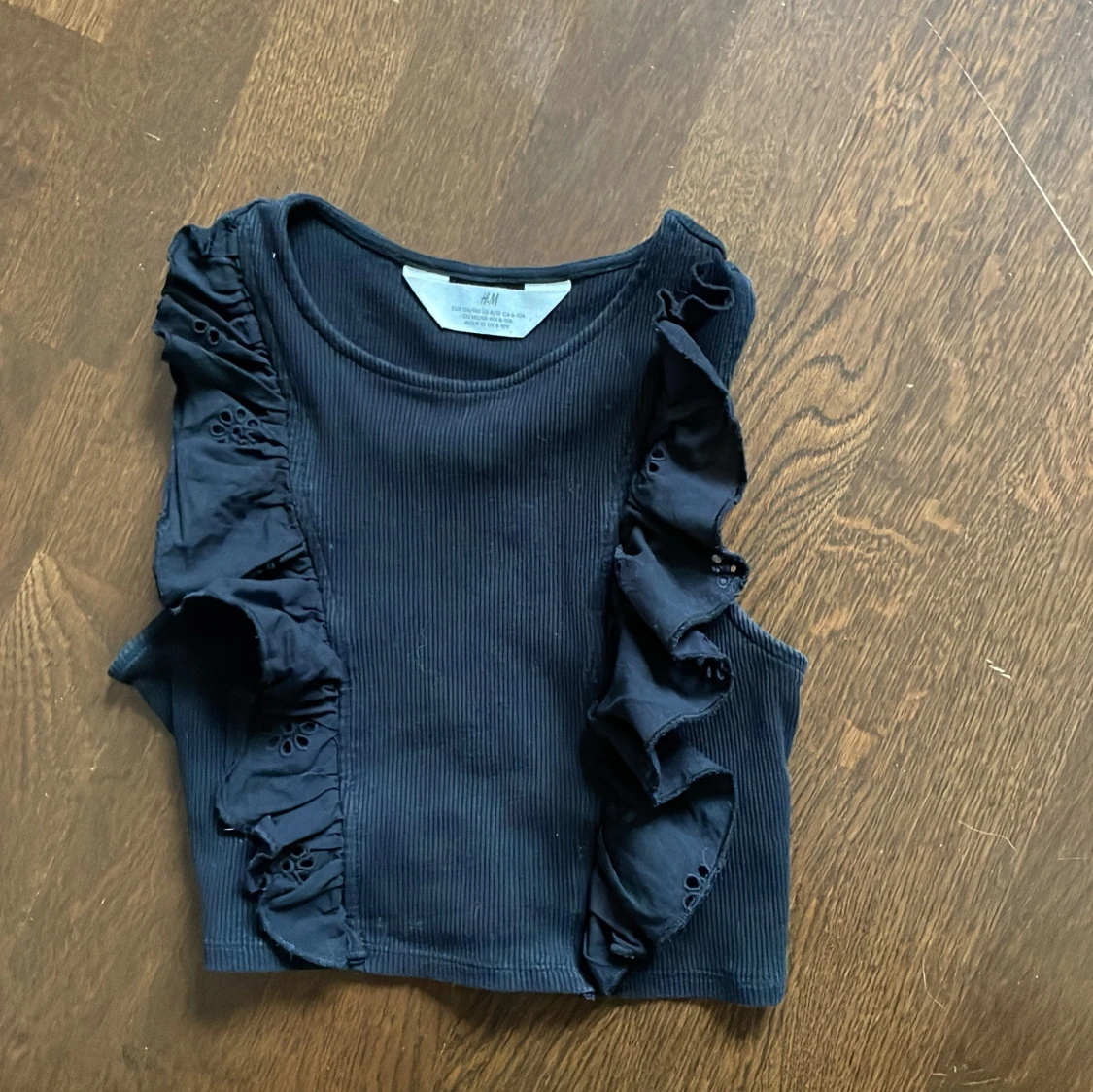 Svart ribbad linnetopp från H&M med breda volangdetaljer längs sidorna framtill. Toppen är ärmlös och har en rund halsringning. Perfekt för en trendig och stilren look.