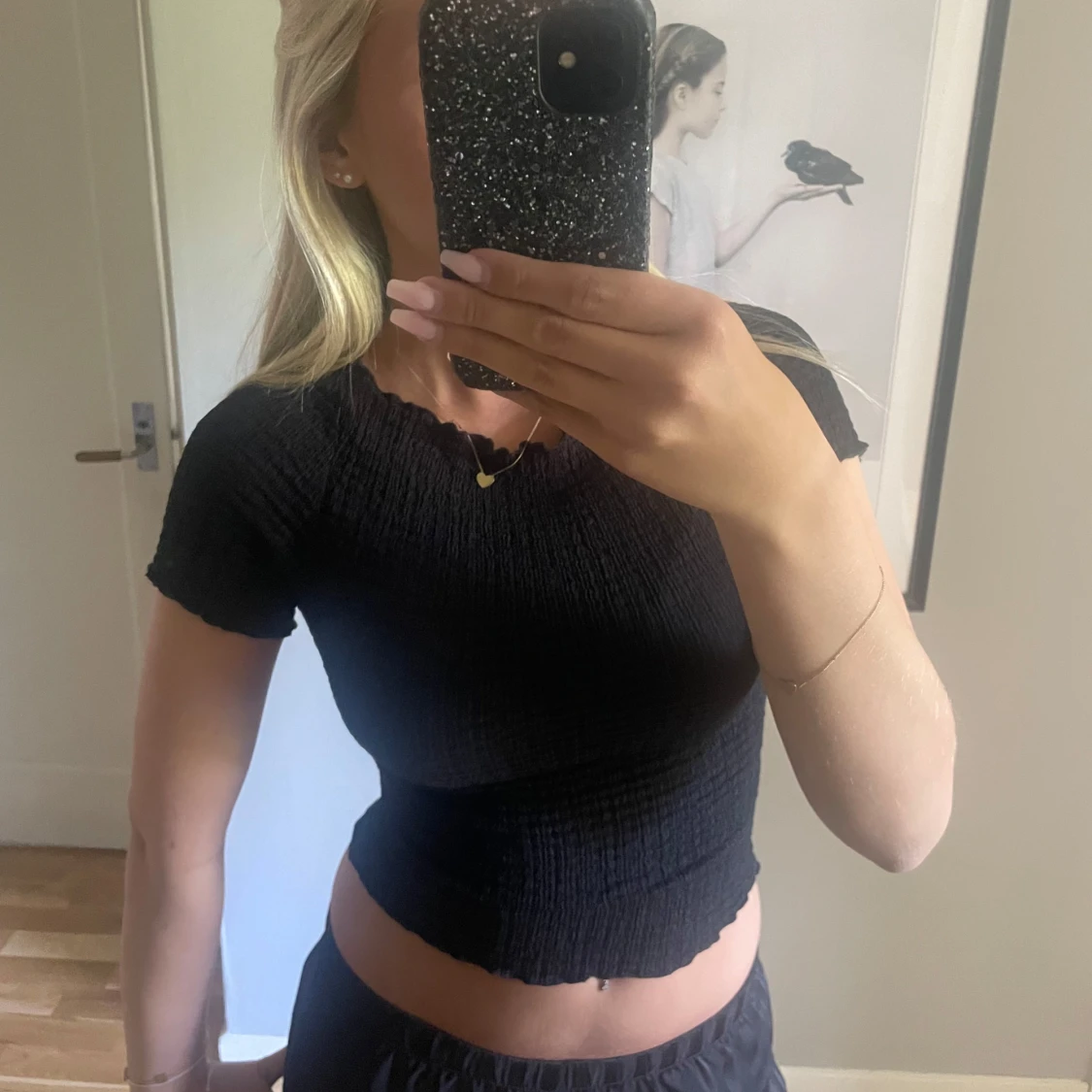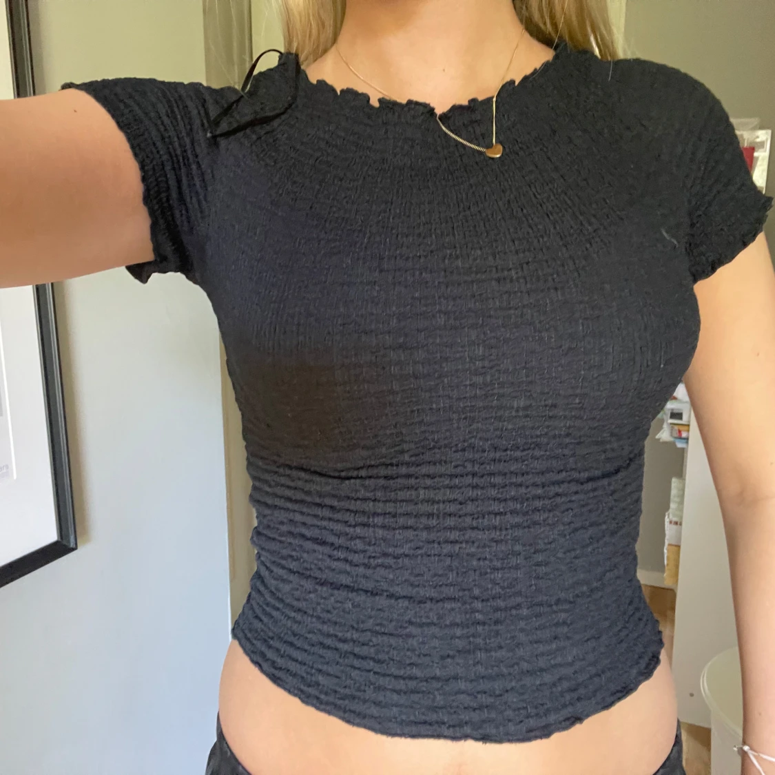 Svart croppad topp med korta ärmar och smockad, ribbad struktur. Söt vågig kant vid halsringning och ärmslut. Figurnära passform som ger en trendig look. Perfekt att styla med jeans eller kjol för en cool vibe.