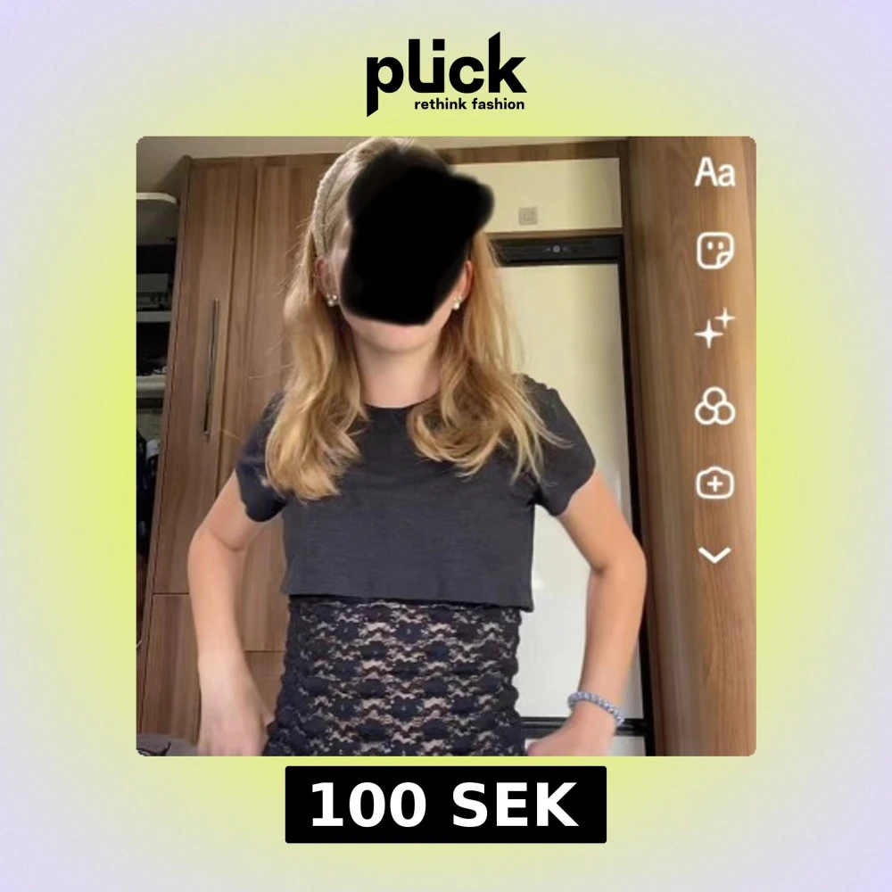 Säljer en svart croppad topp med korta ärmar och genombruten spets över magen. Toppen har en cool lager-på-lager-look där den övre delen är i bomull och den undre delen är i stretchig spets.