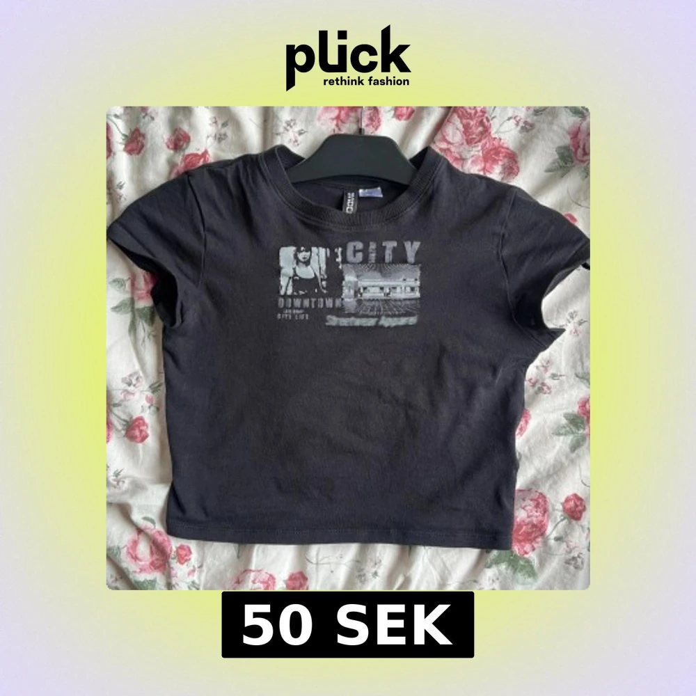 Svart croppad t-shirt från Bik Bok med grått cityinspirerat tryck framtill. Toppen har rund halsringning och korta ärmar, perfekt för en urban och avslappnad stil.