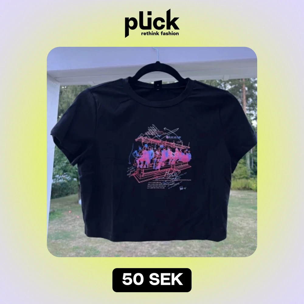 Svart croppad t-shirt med tryck. Säljer den pga att den aldrig blivit använd 🥰 Den är liten i storleken då den passar mig som har S 🌸 (ALDRIG ANVÄND) Längd: 42 cm Axel: 37 cm