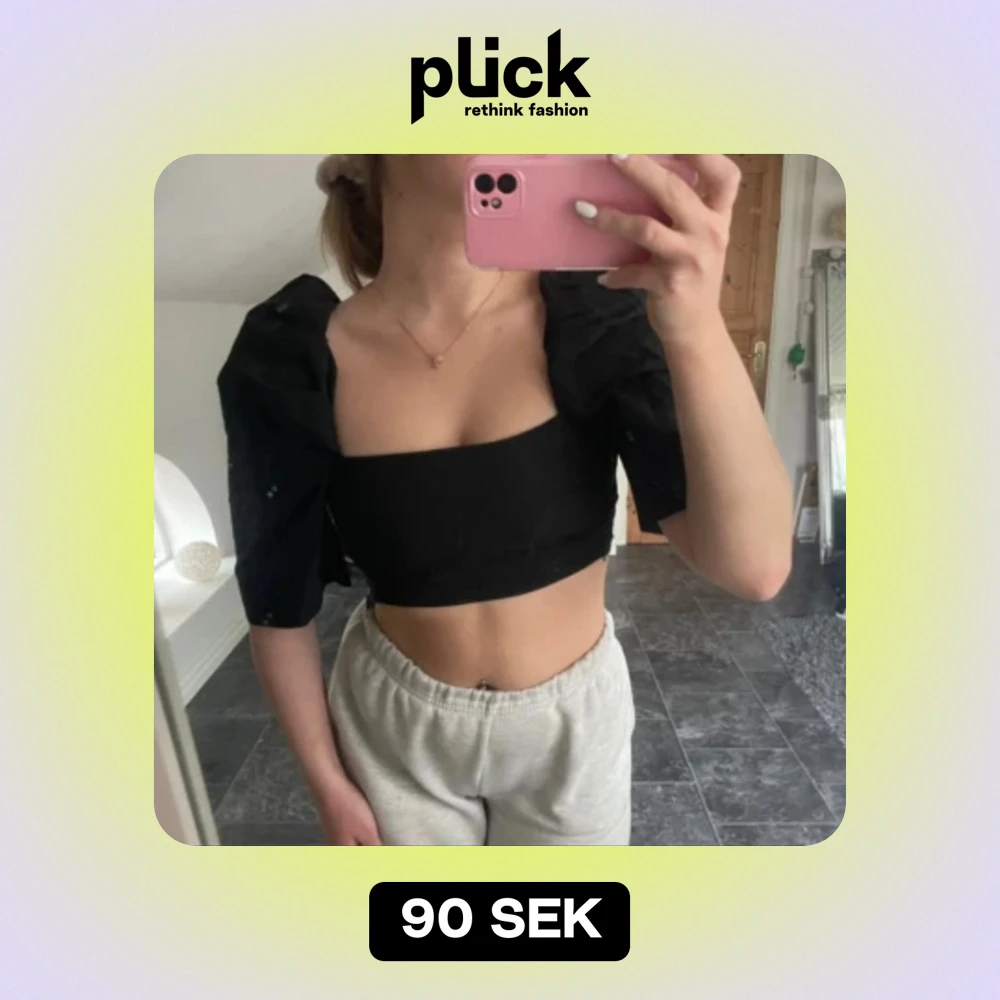 Säljer en svart croppad topp med puffiga ärmar. Toppen är tight och har en stilren design som passar perfekt för festliga tillfällen. Den ger en elegant look.
