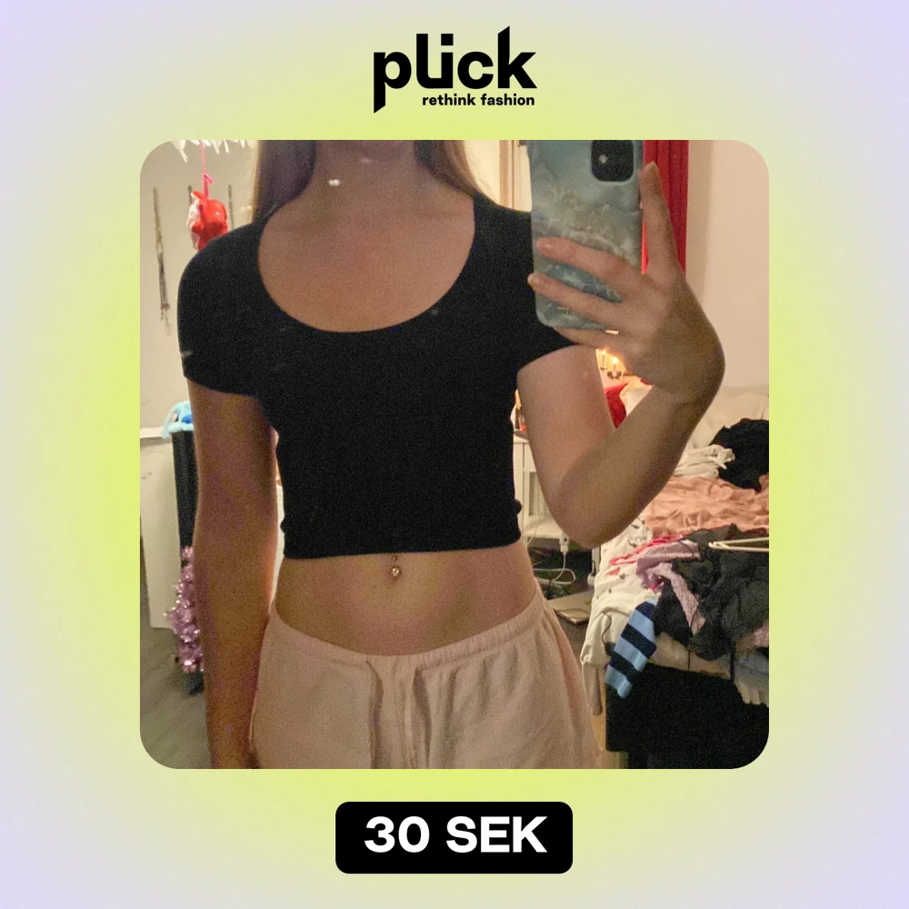 Säljer en skön svart croppad topp med korta ärmar. Ganska kort i modellen (lappen är bortklippt)