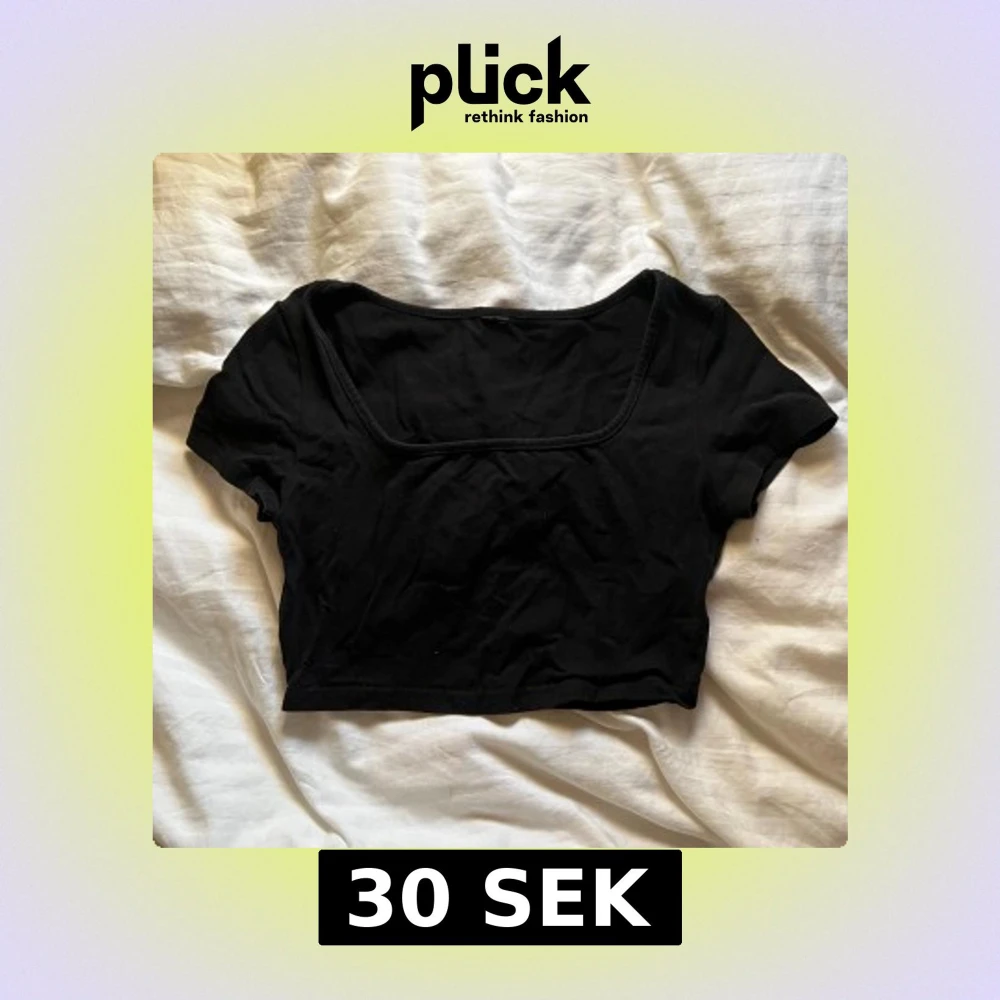 Säljer en stilren svart croppad topp med korta ärmar. Perfekt för en trendig look. Toppen har en fyrkantig halsringning som ger en modern touch.