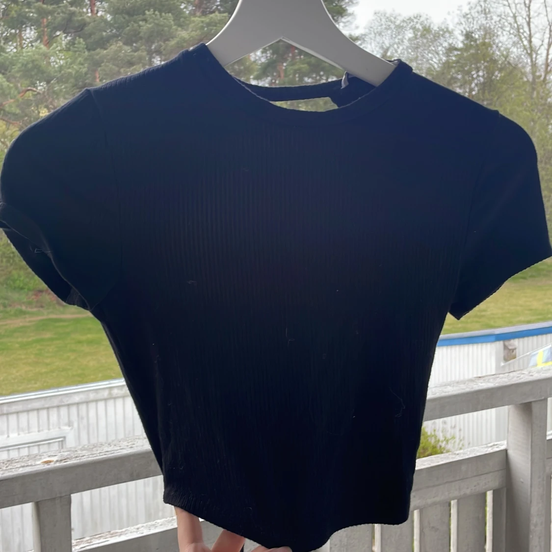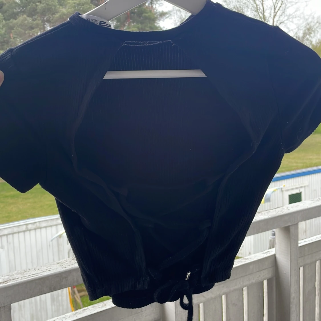 Svart croppad topp från FB Sister med korta ärmar och ribbad struktur. Toppen har en snygg öppen rygg med knytning nedtill, vilket ger en trendig look. Perfekt för dig som gillar stilrena och moderna plagg.