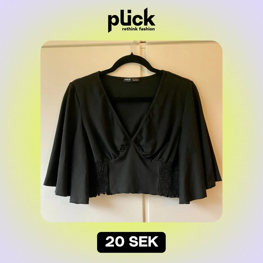 Säljer en svart croppad topp från Shein i storlek M. Toppen har en v-ringad design och vida ärmar som ger en snygg look. Den har en smockad detalj vid midjan för en bekväm passform. Perfekt för både vardag och fest!