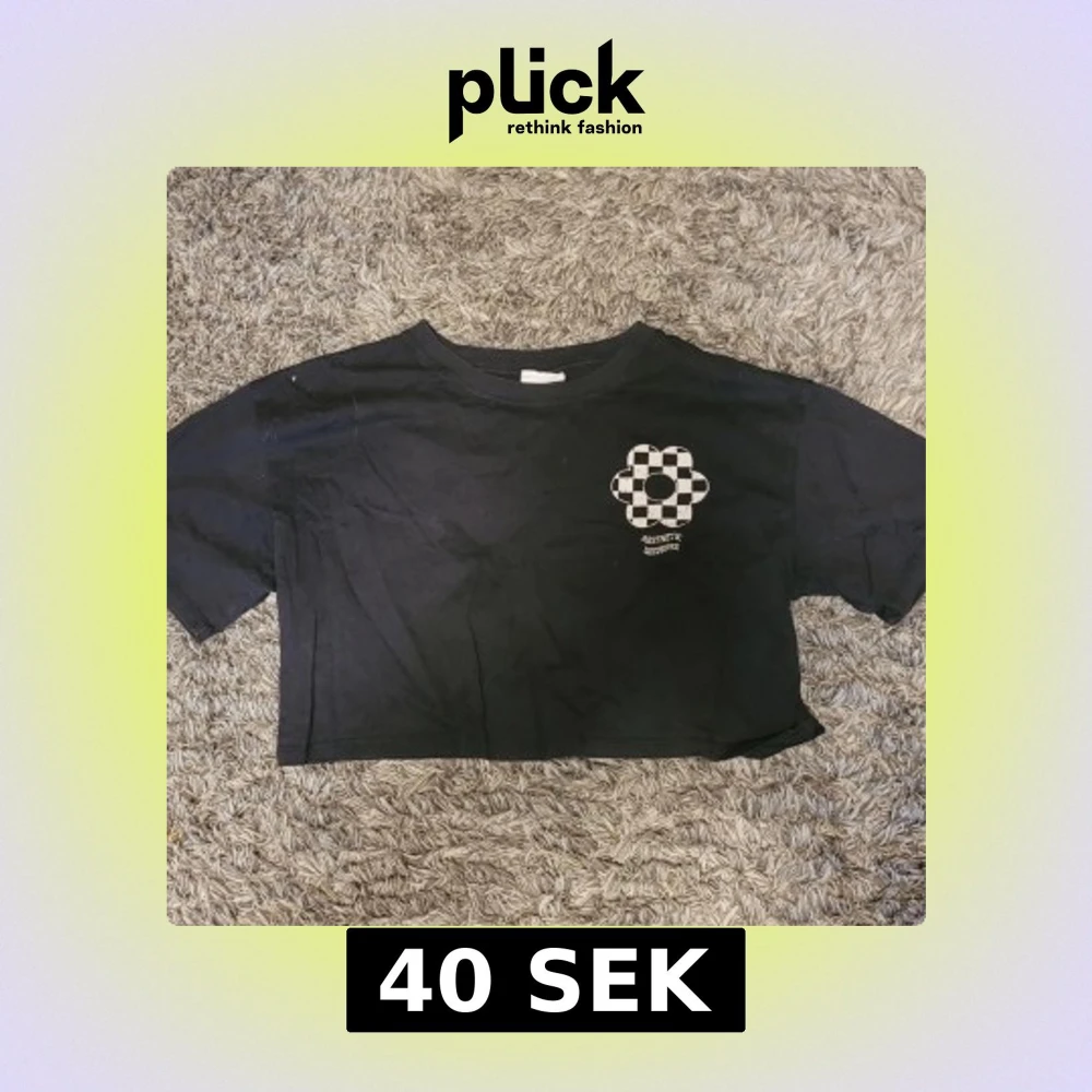Cool svart croppad topp från Kappahl med korta ärmar och ett schackrutigt blomtryck på bröstet där det står 'Aesthetic Universe'.