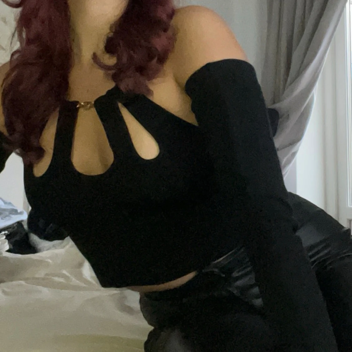Säljer en svart topp ( OBS! inte långa ärmar, dem tillkommer inte, endast styling tips) och croppad passform. Toppen har unika cut-outs framtill och en snygg guldfärgad kedjedetalj vid halsen. Materialet är stretchigt och sitter tight mot kroppen, perfekt för dig som gillar statement-plagg.
