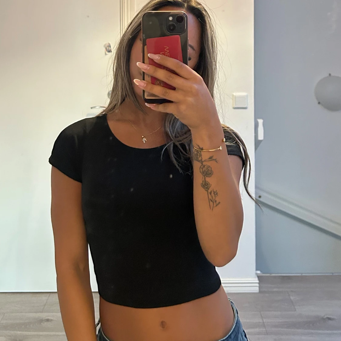 En svart, enkel och croppad topp med rund halsringning och korta ärmar. Perfekt att matcha med jeans eller kjol för en clean och stilren look. Tunn och mjuk i materialet, sitter tight mot kroppen.
