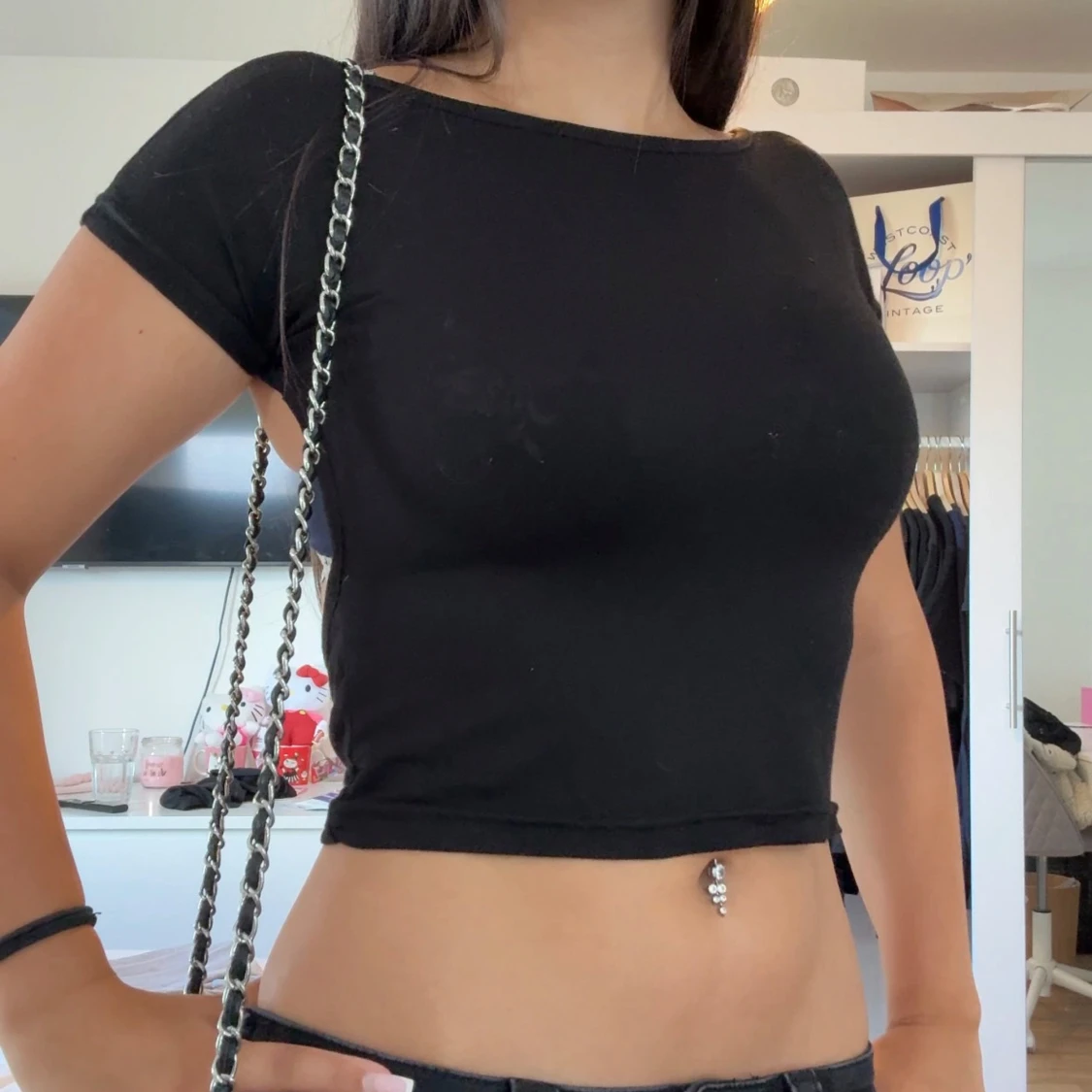 Säljer en svart croppad topp med korta ärmar och tight passform. Toppen har en snygg öppen rygg som ger en cool och trendig look. Perfekt att styla med jeans eller kjol för en edgy vibe.
