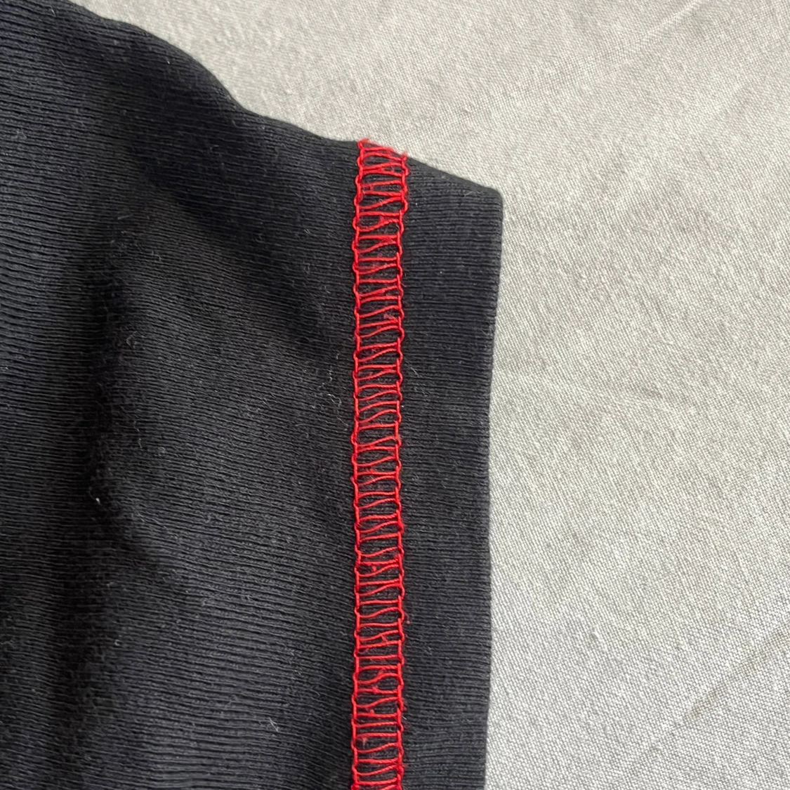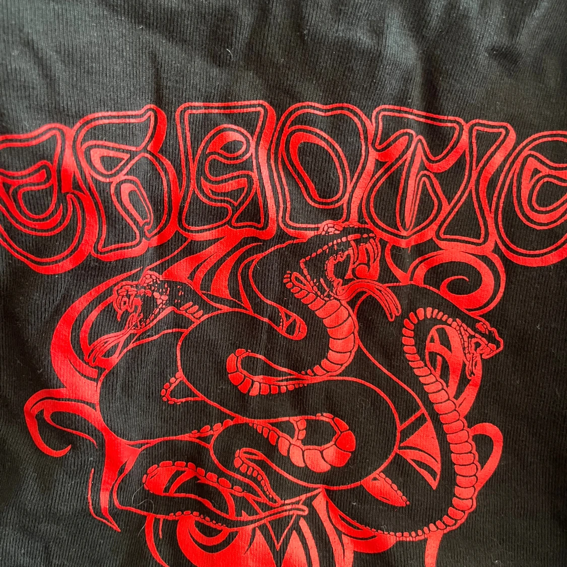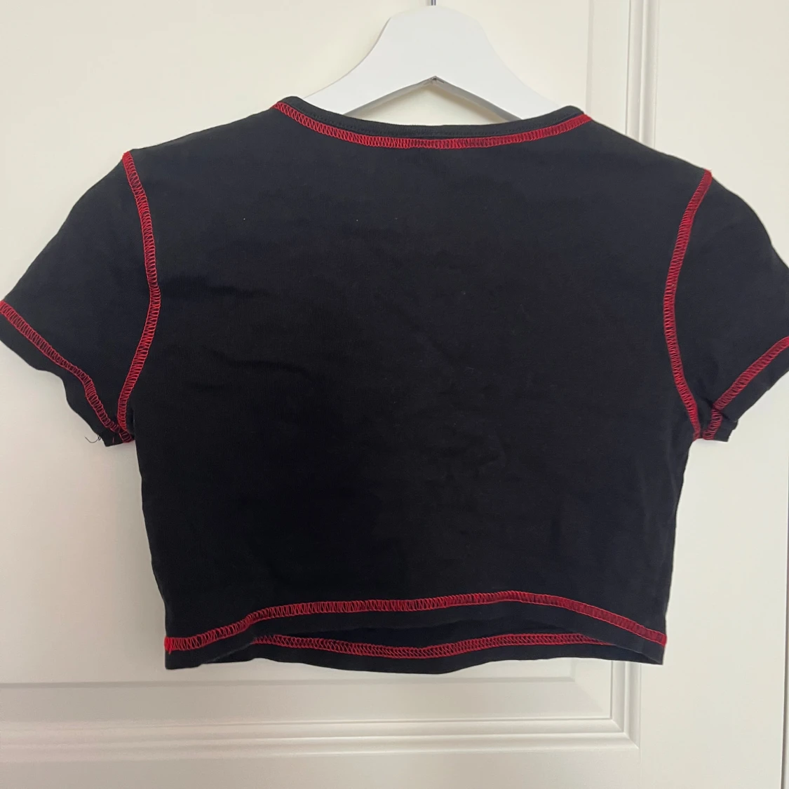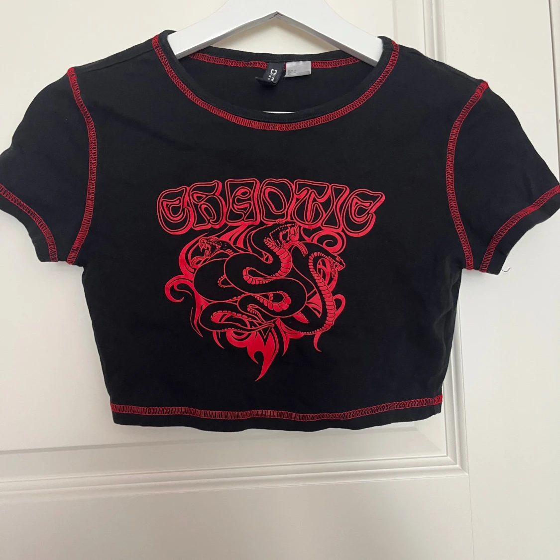 Svart croppad topp från hm med röda kontrastsömmar och tryck framtill med texten 'CHAOTIC' och ett detaljerat ormmotiv. T-shirten har korta ärmar och är tillverkad i mjuk bomull. Perfekt för dig som gillar edgy streetstyle.