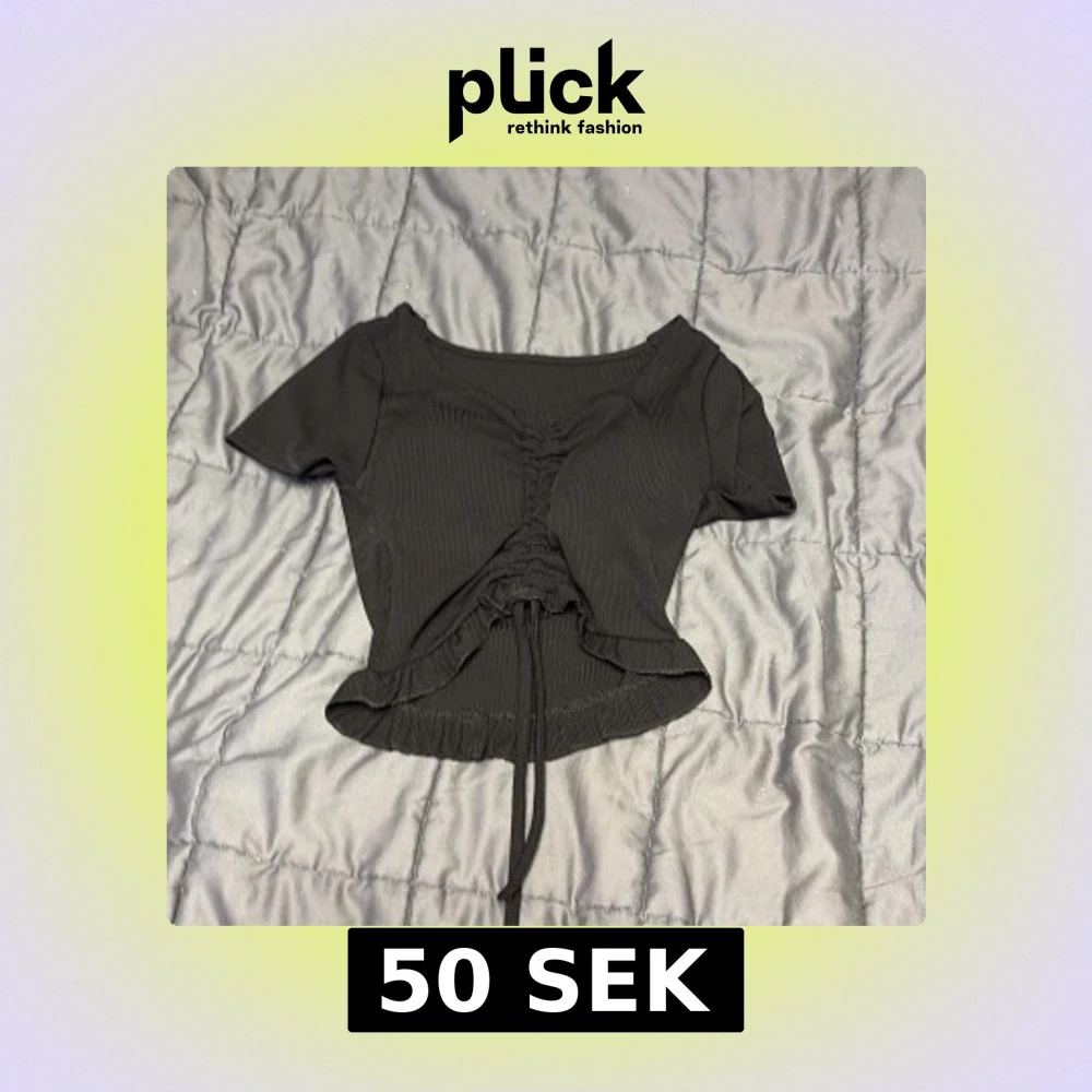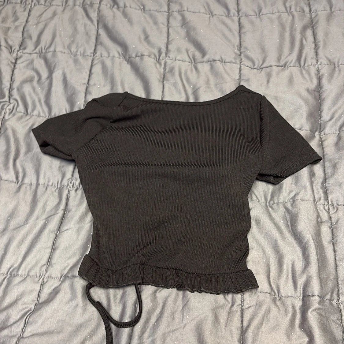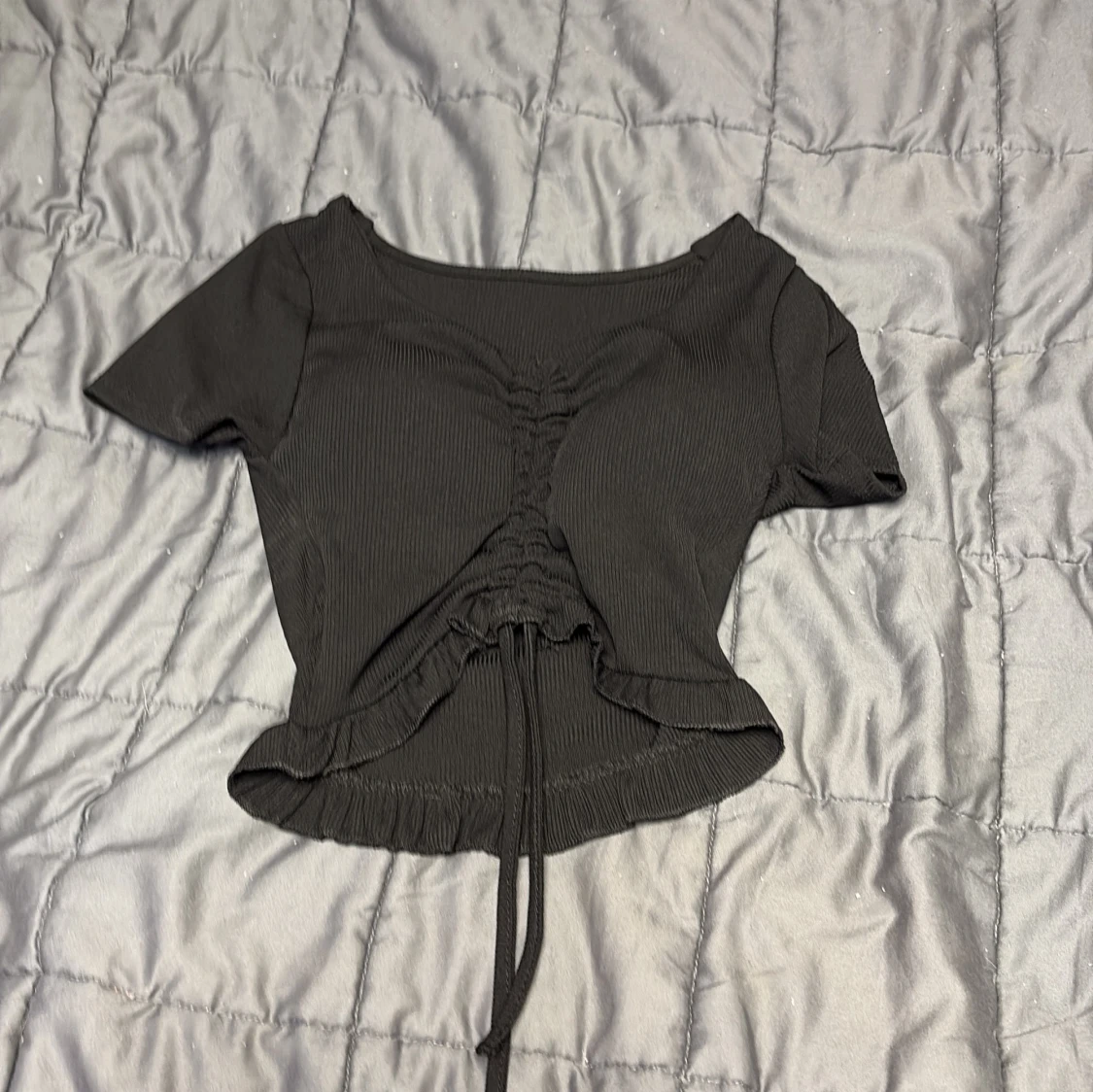 Snygg svart croppad topp med korta ärmar och ribbad struktur. Toppen har en dragsko med snörning framtill som ger en cool rynkad effekt och gör att du kan justera passformen.