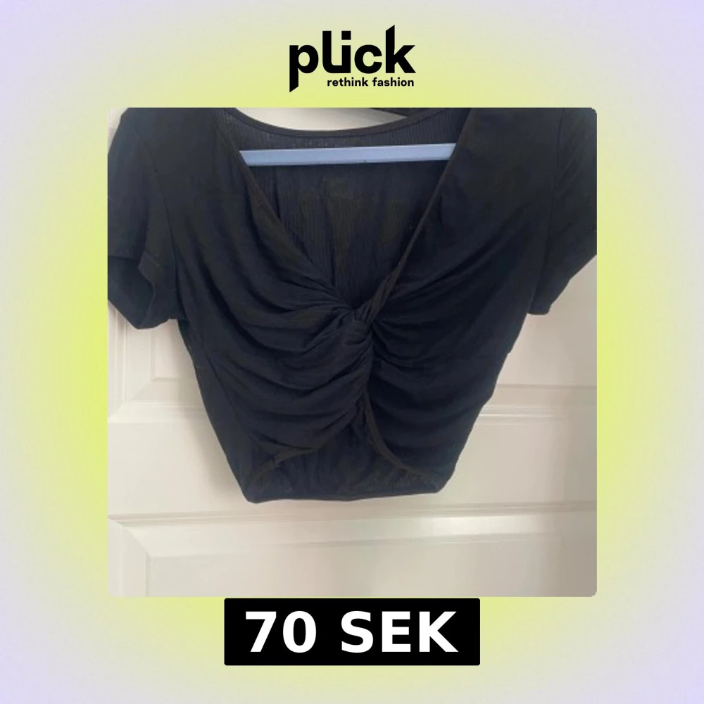 Svart croppad topp med korta ärmar och snygg twistad detalj framtill. Toppen har v-ringning och är gjord i ett ribbat material