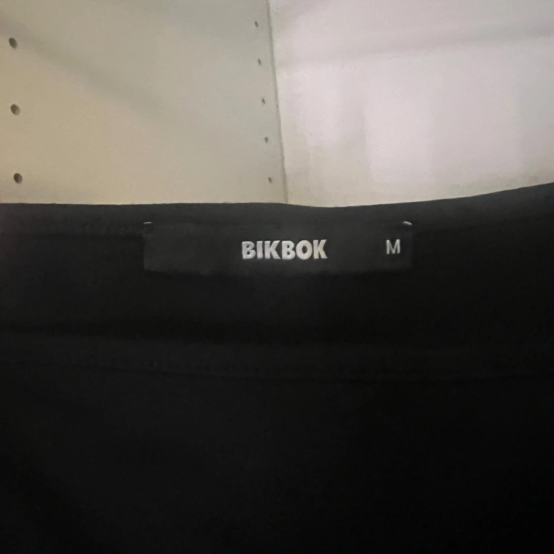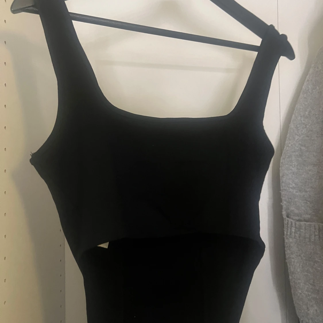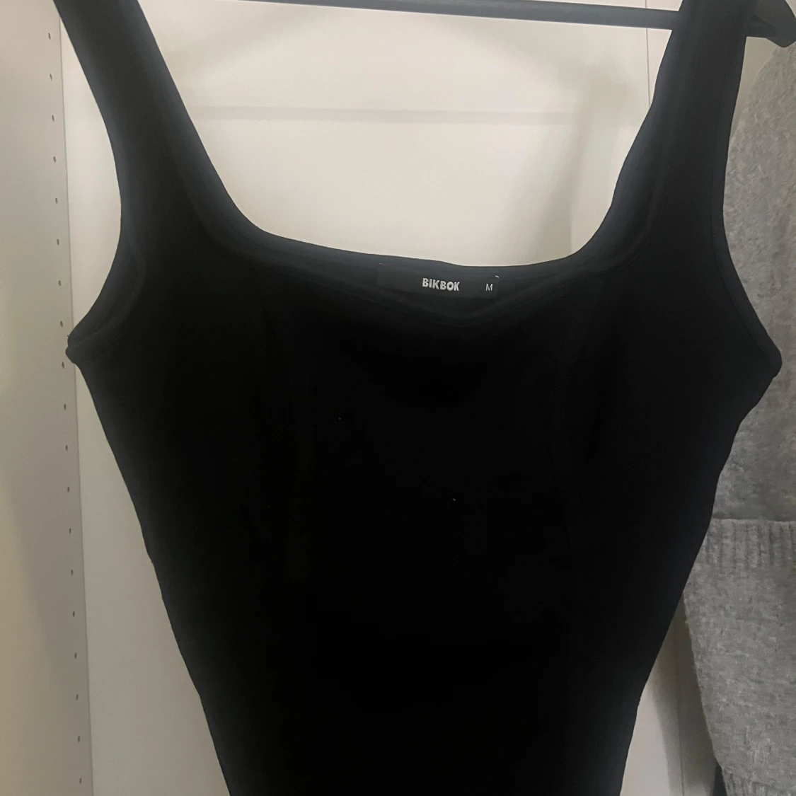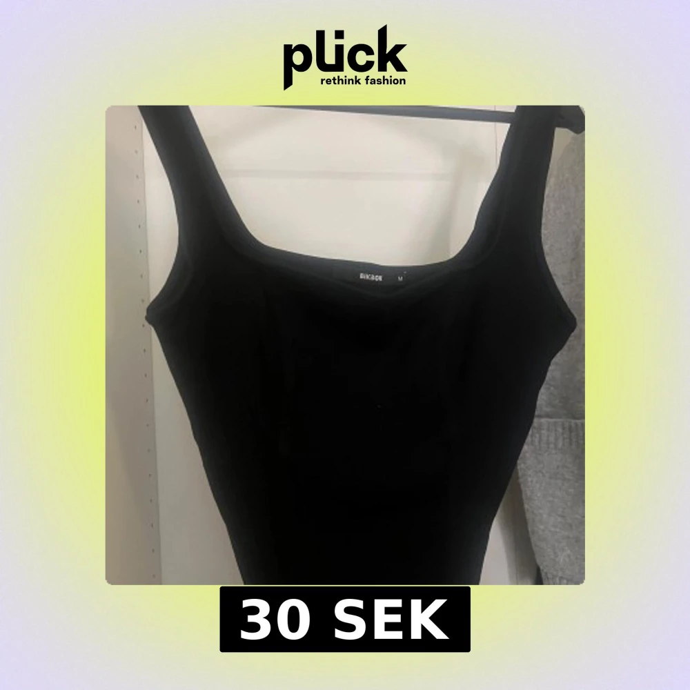 Säljer en svart topp från BikBok i storlek M. Toppen har breda axelband, fyrkantig ringning och en snygg cut out-detalj i midjan.
