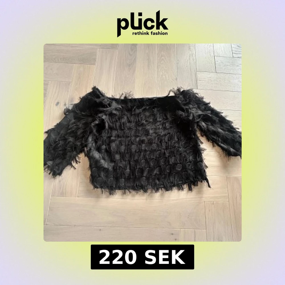 Unik svart topp med fjäderliknande detaljer och en croppad passform. Toppen har långa ärmar och en textur som ger ett spännande utseende. Perfekt för att sticka ut i mängden! Riktigt fest topp! Stolen M men passar även S