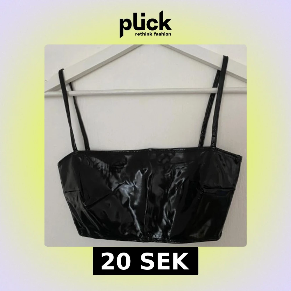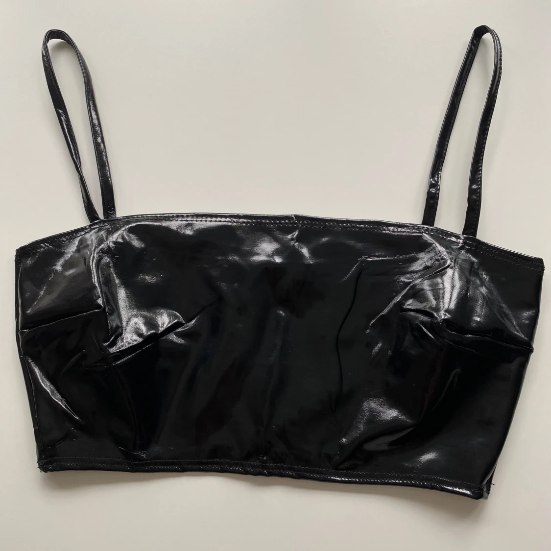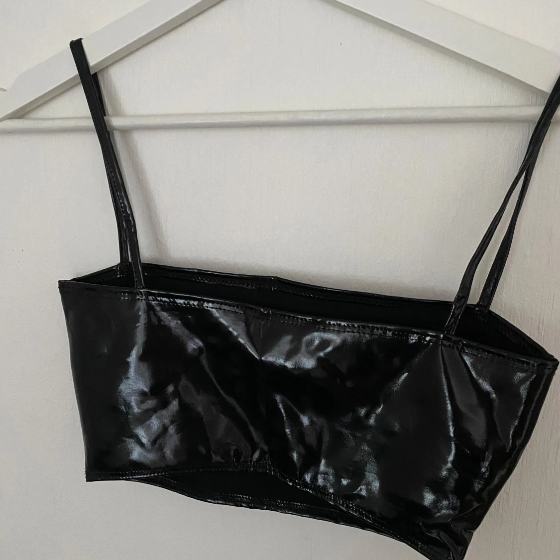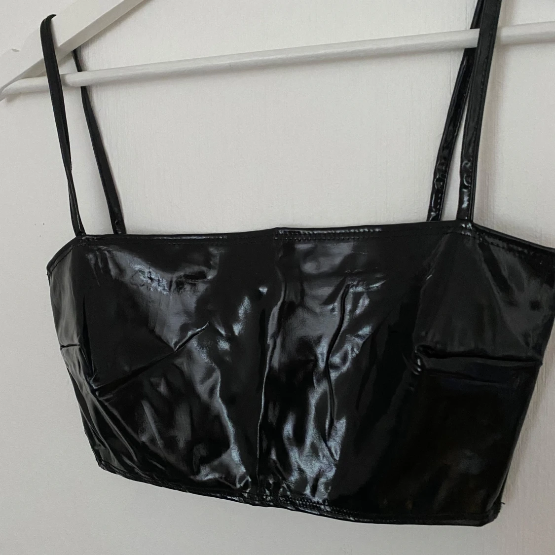 Svart topp från NLY One i storlek XXS. Toppens glansiga yta ger en edgy vibe och de smala axelbanden gör den extra snygg. Materialet är syntet och modellen är croppad, perfekt för att sticka ut med en cool look.