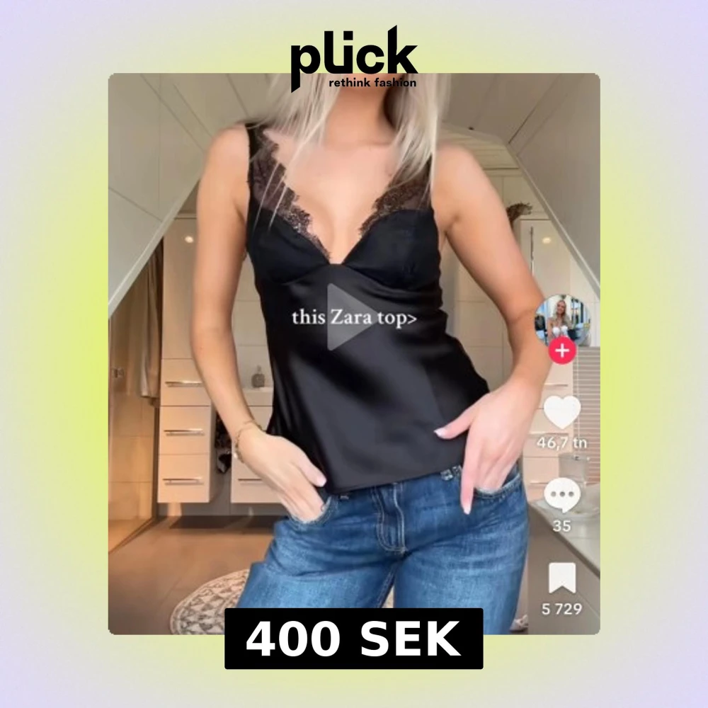 Populär topp från zara! Lappar å allt kvar, säljer då den inte passar mig!Supersnygg svart linnetopp med glättad finish och spetsdetaljer längs axelbanden. Toppen har en djup v-ringning och tunna axelband med transparent spets som ger en extra touch. Perfekt för dig som gillar en chic och trendig look.