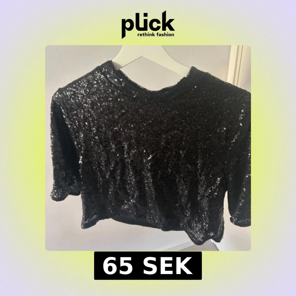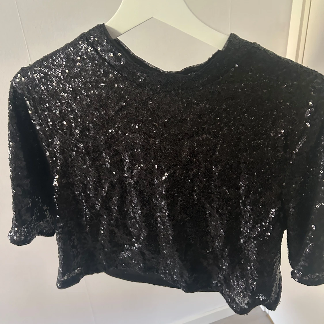 Säljer en svart glittrig croppad topp med paljetter. Perfekt för dig som vill sticka ut lite extra! Toppen har korta ärmar och rund halsringning.💗