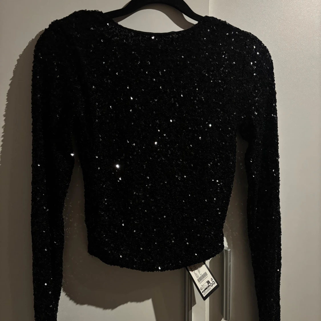 Snygg svart glittrig topp med långa ärmar och öppen rygg. Aldrig använd med prislappen kvar. Storlek XS