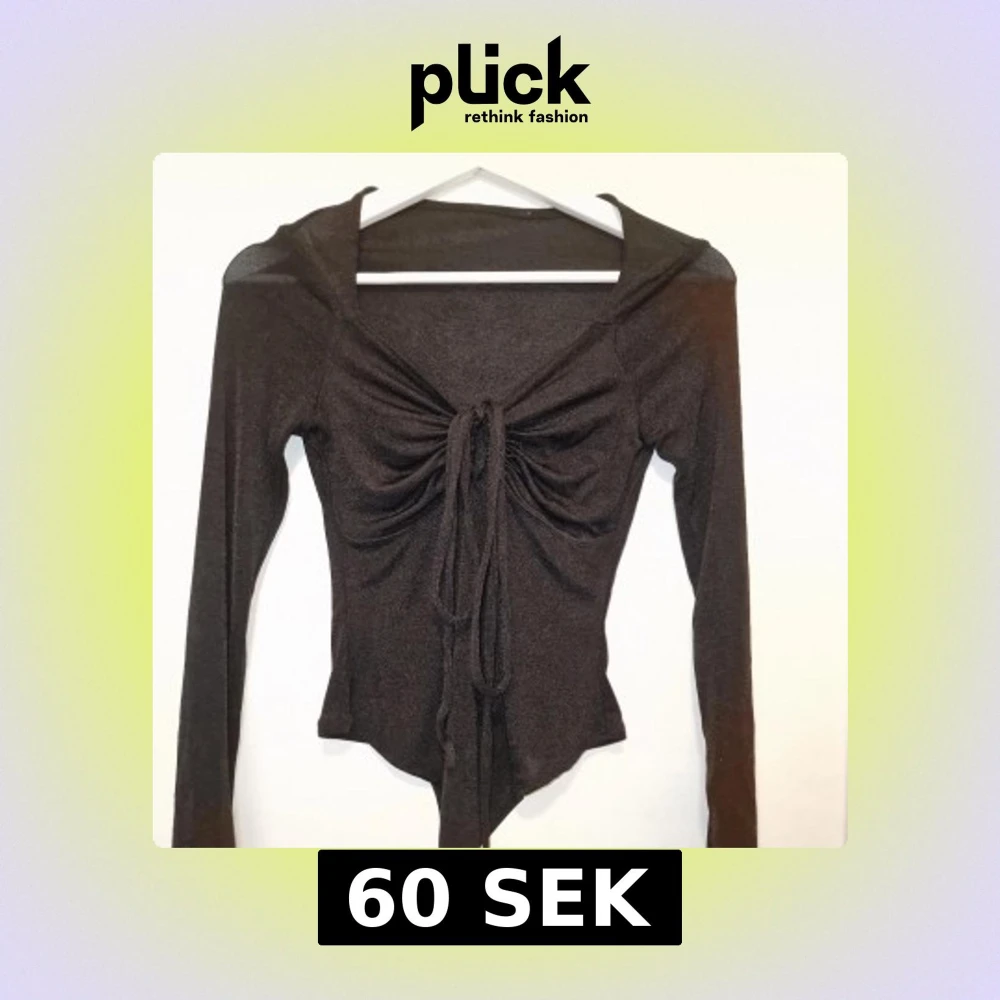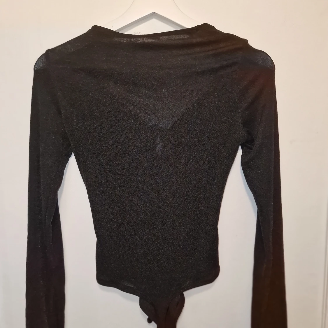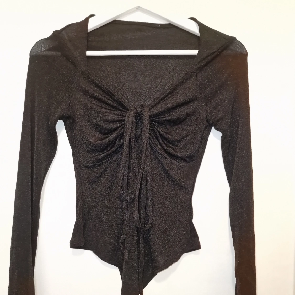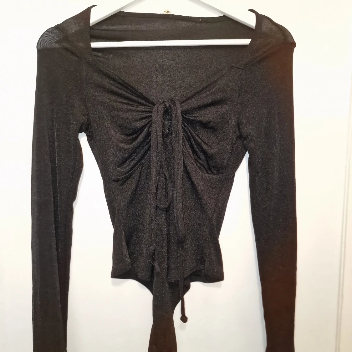 Svart långärmad topp i glittrigt material med djup v-ringning och snygg snörning framtill som ger en rynkad effekt.