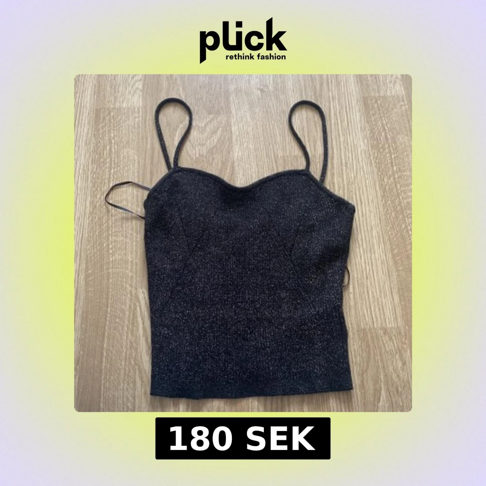 Supersnygg svart linne-topp med tunna axelband och glittrigt tyg. Toppen har en lätt figurnära passform och en söt, svagt hjärtformad urringning. Har bara haft på mig två gånger så den är i jätte bra skick.💕