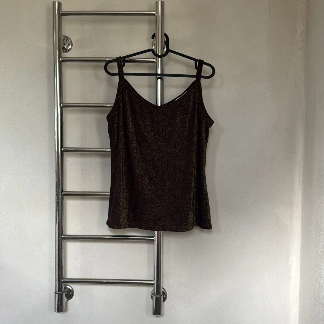 Snygg svart glittrig linnetopp med smala axelband och v-ringning. Perfekt för en kväll ute eller festliga tillfällen. Toppen har en elegant och stilren design som passar till många olika outfits.