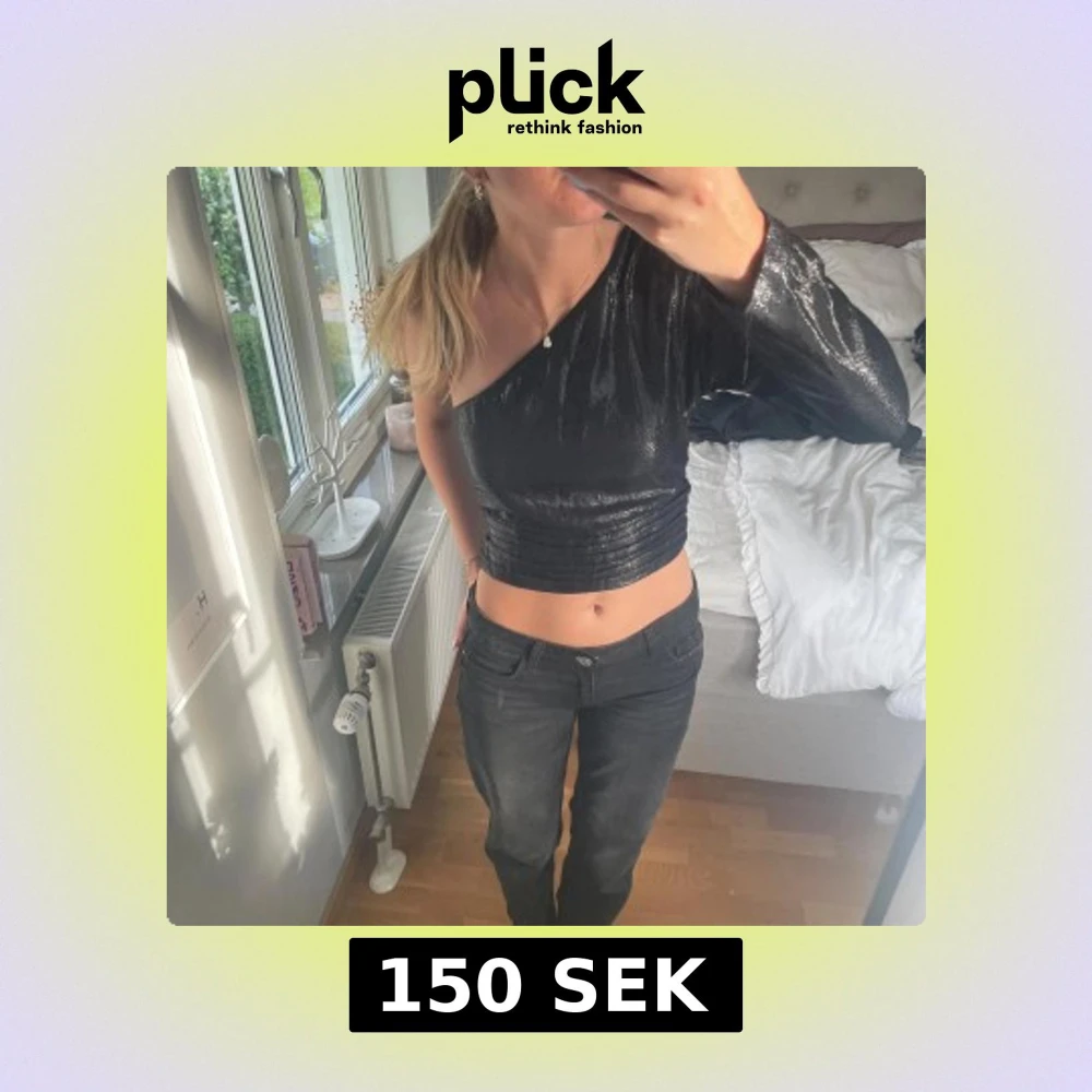Snygg svart glittrig topp med oneshoulder och lång ärm. Croppad modell med ribbade detaljer vid midjan.